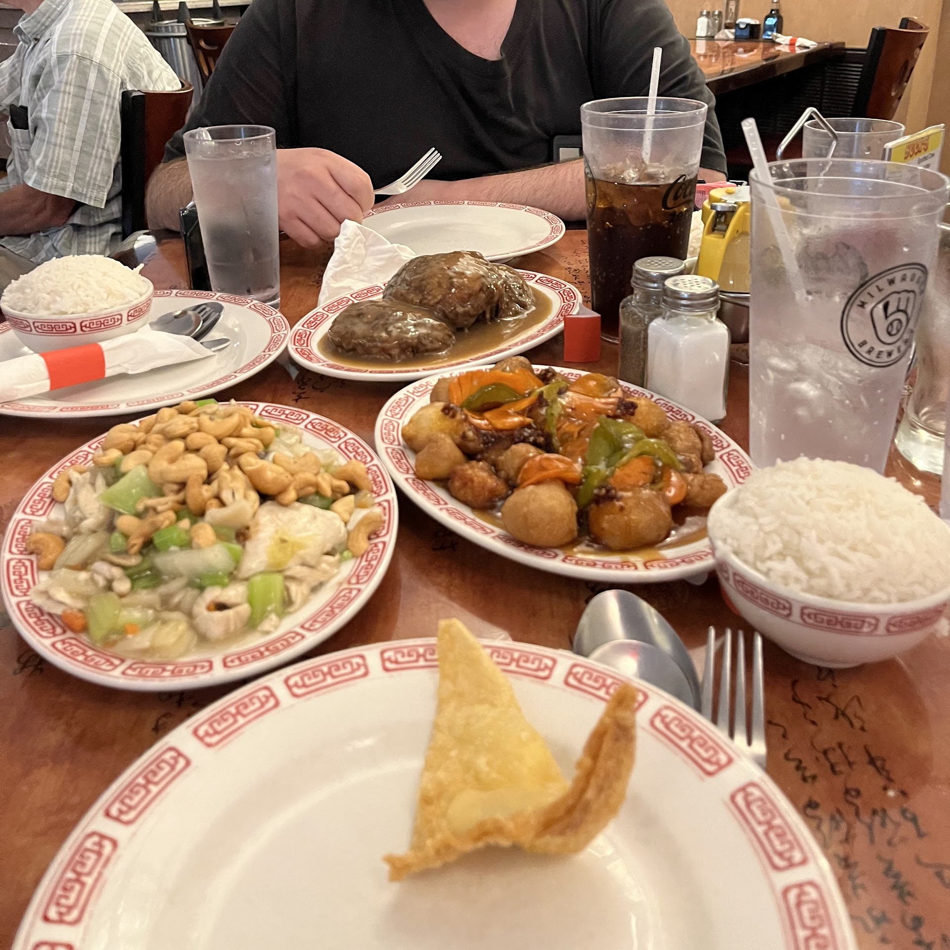 Read moreWe visited this restaurant because their website says they were rated among the top 10 in America in 2010. Overall we felt it didn't live up to this claim. The dining room decor was charming, clean, and spacious. Staff were courteous and attentive. The crab Rangoon appetizer was freshly made, crispy on the outside, creamy & savory on the inside ... delicious! The spring rolls were overstuffed and greasy ... not good. The egg rolls were very heavy with grease, not freshly made, and the veg inside was thick with corn starch ... awful. The egg drop soup lacked the gelatinous body of a fine Chinese broth, the flavor was ok, but oddly served with saltine crackers instead of fried wonton noodles ... mediocre. Pork egg foo young were nicely pillowed, and made with fresh bean sprouts and other vegetables, not much pork (this is ok), but a flour-thickened gravy (not good) ... sadly better than average these days. Orange Chicken was made from frozen nuggets that were dry, and served swimming in a very sweet pineapple syrup ... below average. The Mongolian beef was mostly gravy and onions, the beef was fatty and chewy ... terrible. The restaurant is wheelchair accessible, but the restrooms are not. We would...