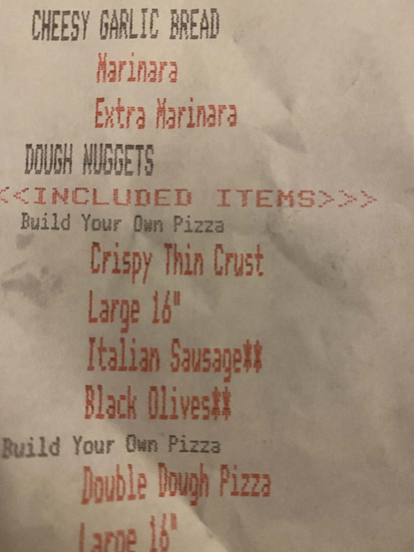 We have ordered from here multiple times over our years in Waukesha. Never once has the order been correct. It has become almost a joke in our house. BUT, they have never messed up my wife’s portion of the order. Tonight I ordered for the family as a treat. 2 large pizzas, an order of cheesy garlic bread with an extra marinara sauce, and an order of dough nuggets. The pizzas came earlier than the order (asked for 6 pm. Showed at 5:45). Not a big deal. But they forgot the marinara sauce. Ok...it’s still early. Wife isn’t home yet. We can fix this. So I call, explain the problem. Twice. Was told they didn’t want to fix it. That a single order of marinara wasn’t worth it. “The delivery driver said he was too busy to bring it by”. Odd. A delivery lady brought the order the first time. So I explained that this was it. We won’t be ordering again. They have a 100% failure rate, and regardless of how much I like the sausage pizza we won’t be ordering again. Response? ...