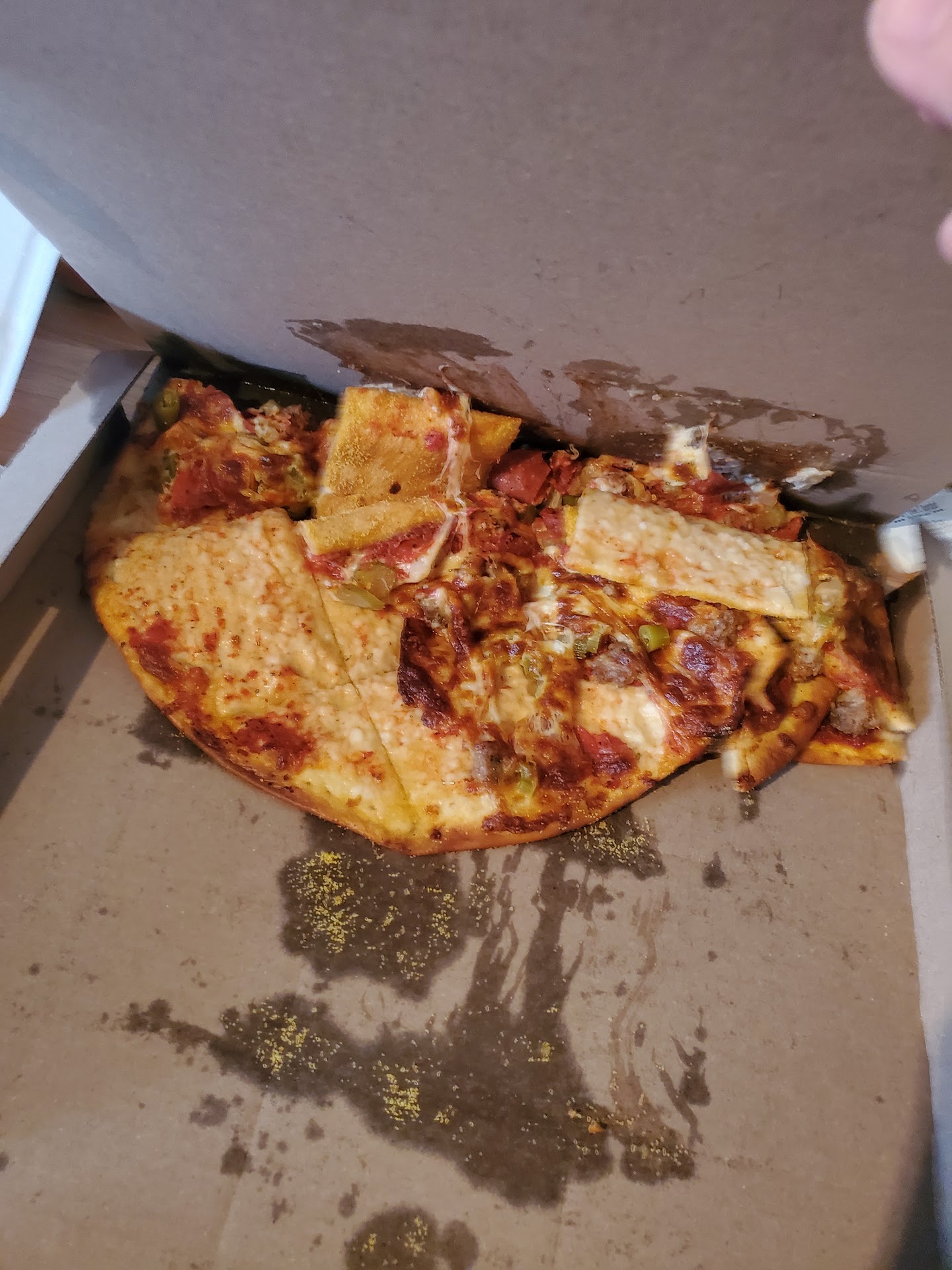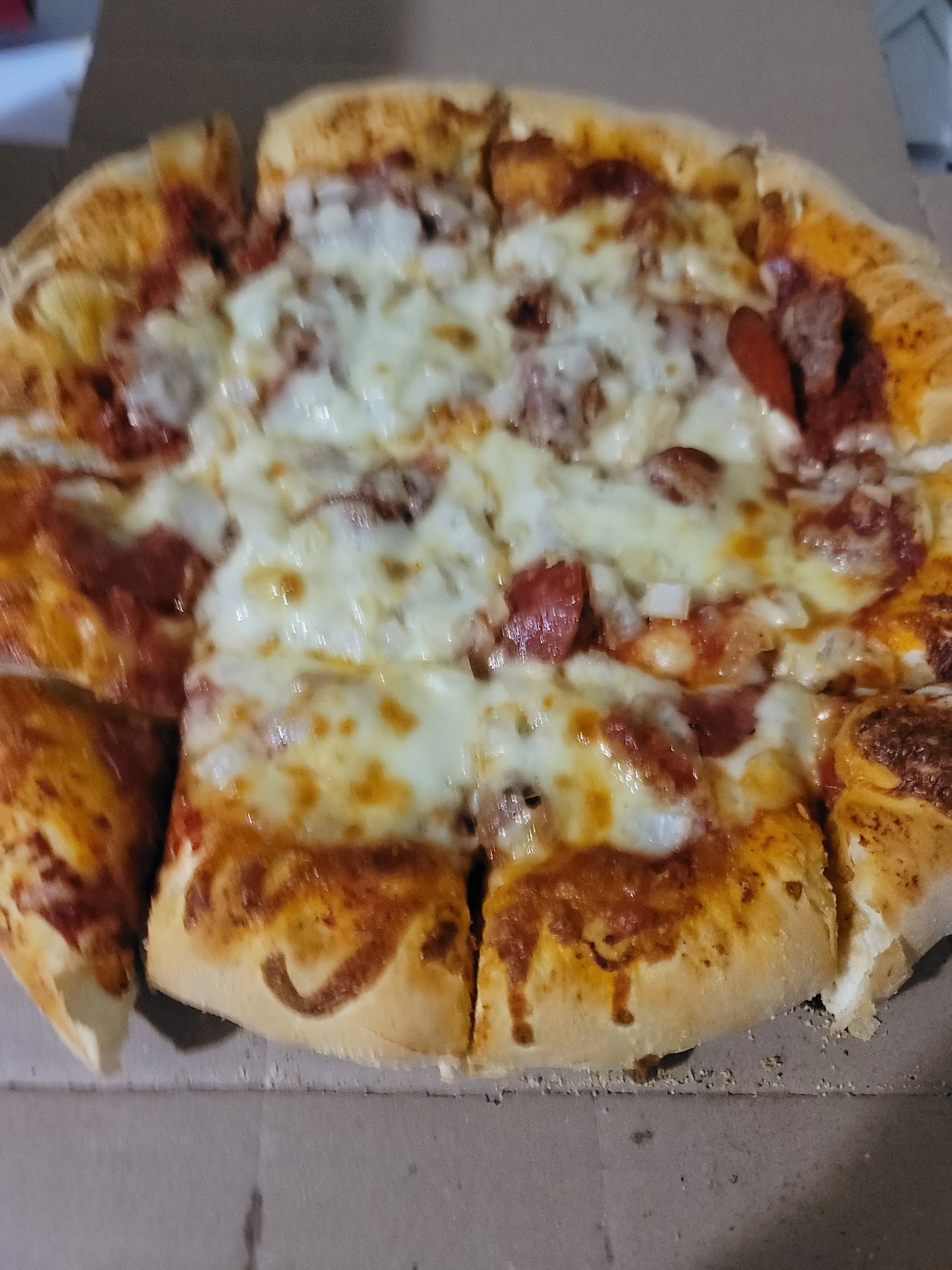 Read moreI stopped going to this place about 4 months ago. Today got a chance for a BoGo pizza. AND under new management, figured I would give them another chance. Well, sadly, new management does not mean new habits. I placed my order online at approx 2pm for a 3pm pick up. I ordered a 12" double dough sausage, pepperoni, and onion with special instructions of well done and extra sauce. I got to the store at 2:48pm and my pizzas were already done, and under the heat lamp. I asked what yime they got done at, and the reply was ohh about 10 min ago. At that time I asked the guy isn't 20 plus min early for a 3pm pick up too early? His reply was just a blank stare. Not even a hey ya you're right, or ya sorry about that. AND when I walked in, 3 guys were just standing around doing nothing. I have included a picture of my "Well Done Pizza" To end this, by the time I got home, my pizzas were done for 30 min, and only warm to touch to eat. VERY...
