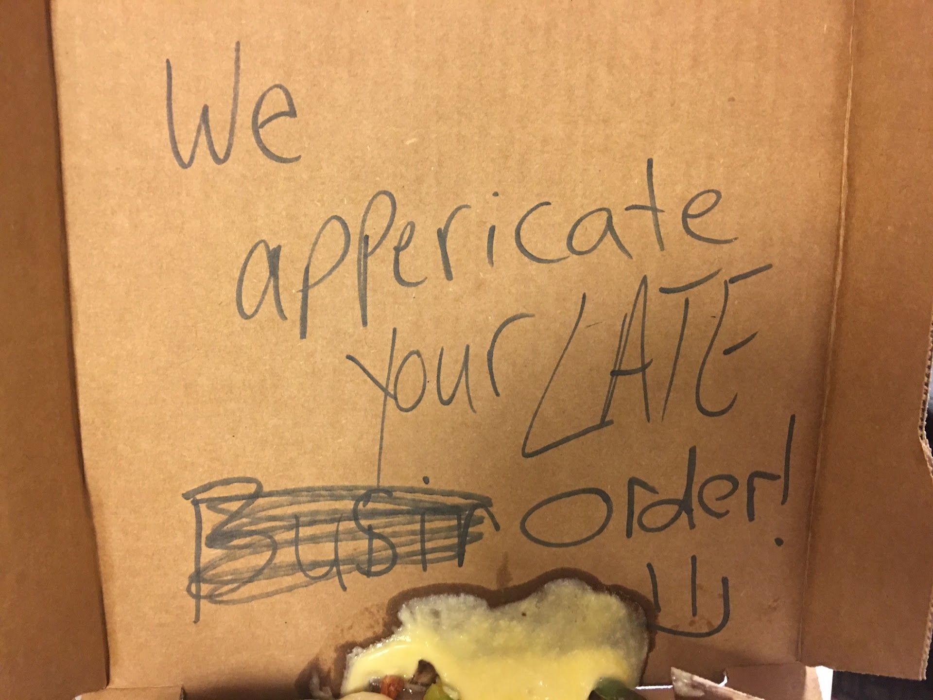Read moreI have ordered from this location several times a week for over a year. I get a discount because I work at a hotel in the area. I often don't order until 2am, and have always been greeted with a smile and pleasantness. When I called this time, a woman answered the phone and there was a lot of sighing, and she tried to charge me regular price, instead of our discount. I will NEVER recommend this place as a delivery option ever again. When my order arrived, the deliver person, a young female, ripped the tag off the box and wrote a "manual CC receipt" because she said the machine didn't print it out (ie she forgot it and didn't want to go back to get it) I sure hope I am not charged like 600$ for this pizza. So after this, I'm like well, its here and I open the box to be greeted with: "Thanks for the LATE busin- (crossed out as if I wasn't considered business) order" with a smiley face. It was written in black magic marker on the inside of the box where my food could touch it. I had reservations, but I ate some of it. I hope I don't die from what ever bodily fluid they decided to put in it. I honestly cant believe these people have jobs, much less in the customer service field. By the way, this is my first google review, I just had to say something. What a disgusting adventure it was. NEVER EVER...