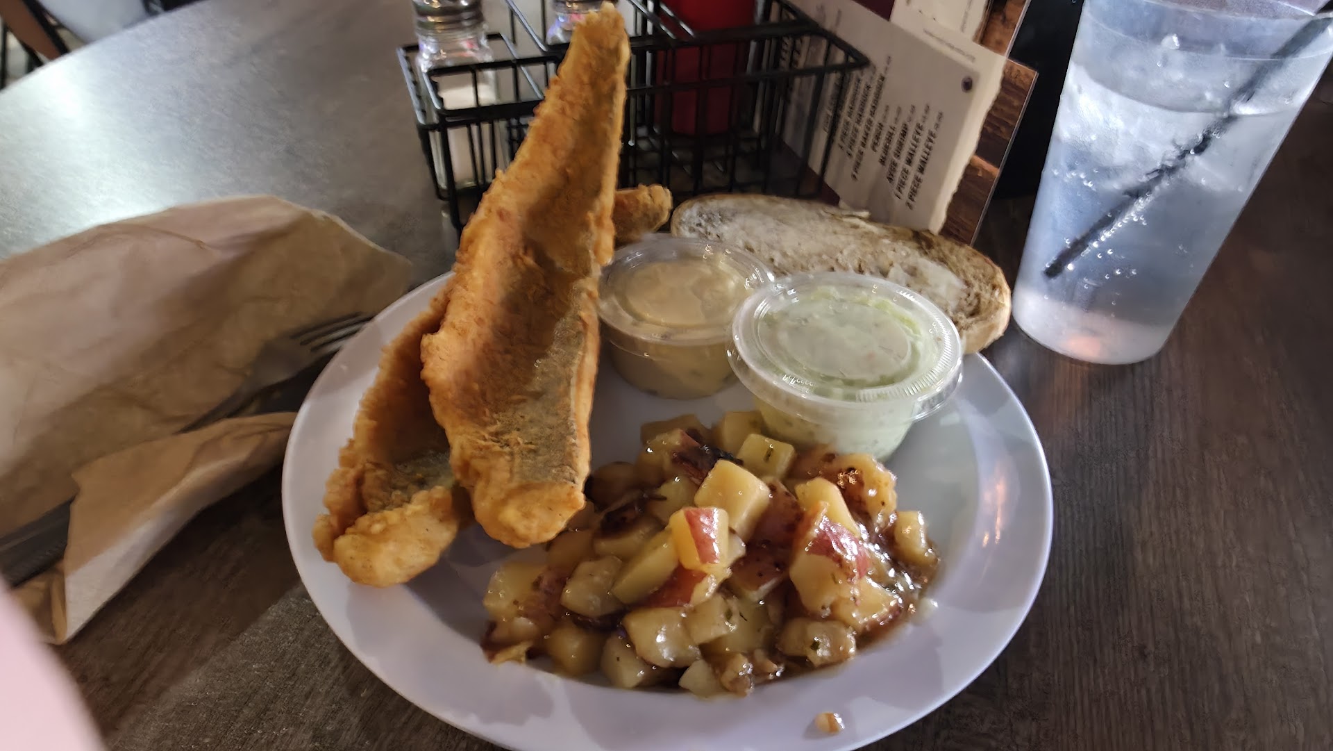 Read moreNot our first time eating here but first time we have gotten an appetizer. Hands down the best beer battered cheese curds I have ever eaten!! I usually like the breaded kind vs beer battered but these were amazing!! My husband and I sat at the bar and we were able to eat right at the bar. It was very comfortable no lip on the bar so it wasn't awkward to try and eat our fish fry. He got the blue gill with hot German potato salad. I thought the potato salad had a little too much vinegar, but im picky. He really liked it. He loved his fish also. I got the 2 piece haddock with chippers. Fish was amazing, lite batter not heavy and greasy. The chippers came with a French onion dip but it wasn't very strong, it has been better. My chippers were pretty greasy and soggy, I've had better there also. I like them crispy! Very nice place to eat. I highly recommend Friday night fish fry! We have not ventured further on the menu but my son says the...