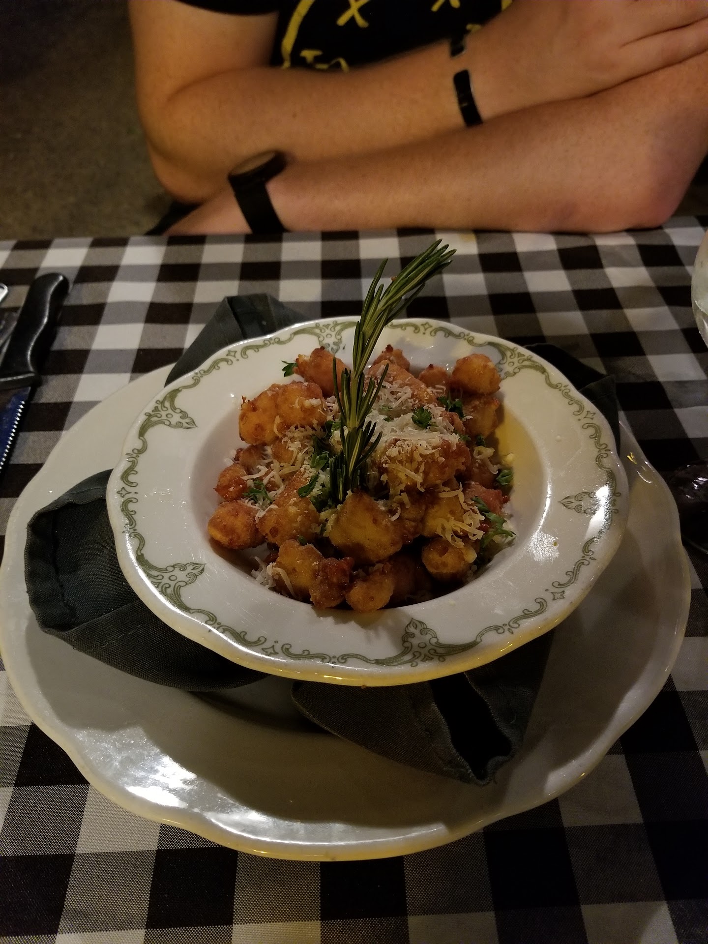 The food was actually really good but it was so overpriced and the horrible service really overshadowed our entire experience here. Do not order the cheese curds here: there are much better ones pretty much anywhere else in town. The lobster bisque was fantastic and the Lumberjack Pasta was pretty good though nothing to write home about. They messed up my husband's order as they gave him vegetables instead of the garlic mashed potatoes he ordered.