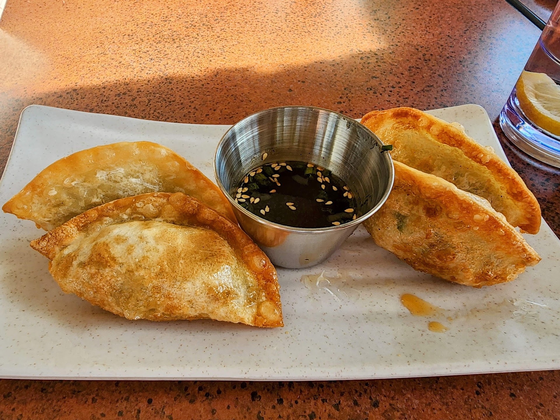Since I haven't really had Korean food before, I was more worried that I would order something I couldn't eat. I like spicy food but scales can be different across cultures. I eat what our local Mexican restaurants say is #10 when it comes to the spice in my food. But that's jalapenos. I don't know what kind of spice is in Korean food. I landed on a dish that I saw on the Google Maps Menu that was not actually listed on the restaurant's menu. The lady said this could be found in some cases because they are actively updating their menu to suit the crowd as stated above. So I ordered the mandu for a starter knowing I'd be safe with "dumplings" if things didn't go my way. Then I went out on a limb and ordered Spicy Garlic Gangjeong ($17) which was AMAZING! "Boneless fried chicken and shrimp with a spicy sauce sauteed with garlic, scallions, and red bell pepper" that comes with a bowl of white rice (at diner's request) or a bowl of fried rice for a $3 charge. My friend ordered the Bibimbap ($15): "A signature Korean dish served as a bowl of warm rice topped with namul (seasoned vegetables), ground beef, and a fried egg. It was delivered to the table on a tray with a side of kimchi and a small bowl of miso soup. She thought the dish was good but she absolutely LOVED the soup!