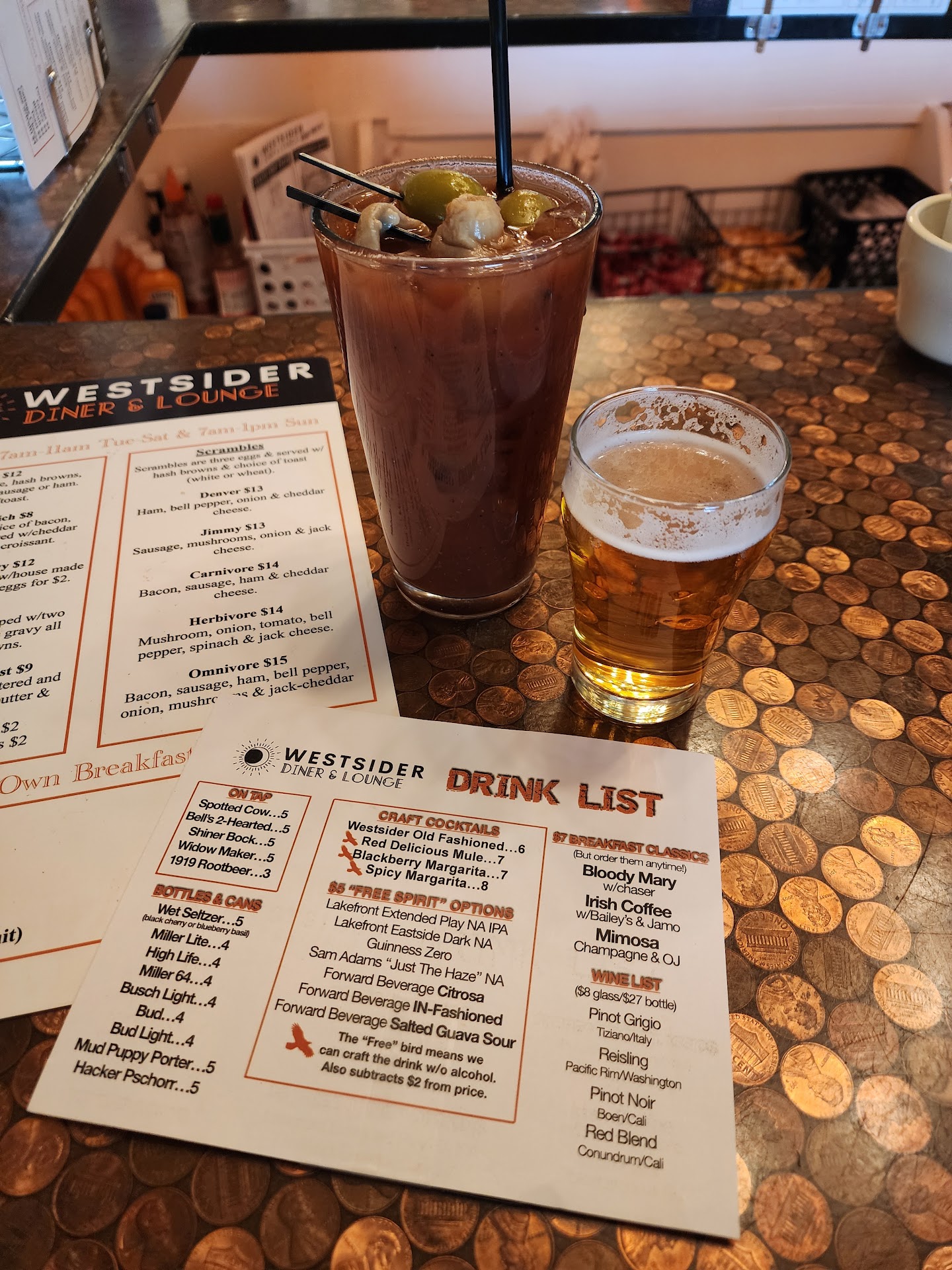 We came in on a Saturday around 10:30. Hubby ordered French Toast to hold us over until they began serving lunch at 11. Then it was time for Bloody Marys and Modelo chasers. I ordered the M&O Burger (caramelized mushrooms and onions over a patty with cheese) and hubby ordered the Westsider (fried egg, bacon, and cheese over a patty). Even the fries were delicious!