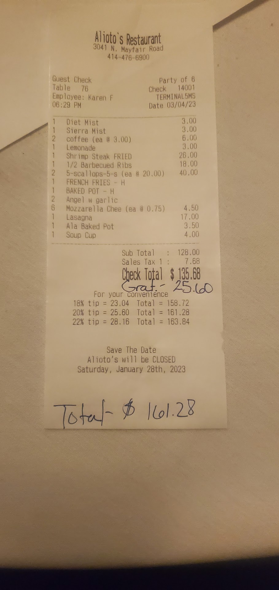 Everything about the service was wrong, wrong, wrong. Do better Alioto's but with someone else because our family and friends will NEVER be back. Not sure if you all are racist or just unstable.