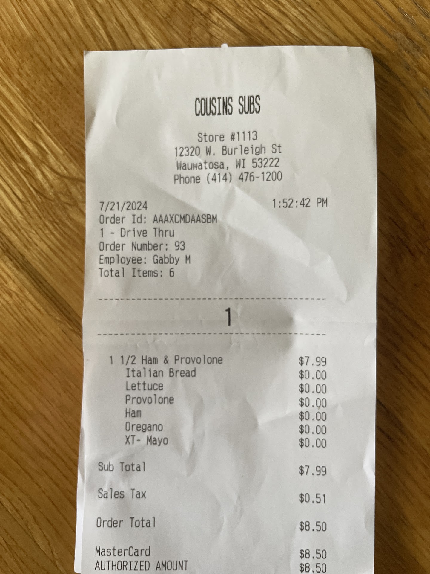 Ā Ā Ā Read moreTERRIBLE! Came to this location yesterday as we used to live in WI and canāt get Cousins in MO. Our order was rung up wrong - no big deal. They refunded part of the order and made the correct sandwich. Today, on our way out of town, we wanted to stop by for another and grab one to bring home. We put in our order at 6:34p and took a seat 25 mins later and we start hearing commentary about them being out of regular bread. The cashier came over to ask what other bread weād want - garlic or multi. We said garlic given the only options (even though multiple cars had come through the drive thru and gone as well as at least 2 other customers after us so likely we couldāve gotten regular bread but our order wasnāt made timely. After agreeing to garlic bread the cashier then came back and said there was only enough bread for 2 of our 4 sandwiches at which point I just requested a refund for half our order since it wasnāt going to be what we ordered anyway and we had already waited 30+ mins for our food. Not even an apology from the manager. Other customers had issues and no apologies either. A gentleman waited 15+ mins to speak to the manager and ask for Corporateās phone number and she didnāt even acknowledge him. Avoid this location...