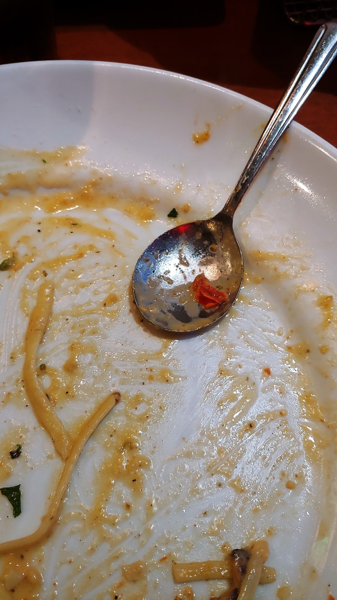 The place is dirty. Gross- bathroom photos included which is leading a mess into the hallway towards tables/bar I got my plate of food, there was a soup spoon sticking out on my plate (I got steak and pasta with shrimp. Nothing that needed a spoon what so ever.) I took a photo of what the spoon look liked (I did not use it or put anything on it. As seen in the photo is exactly what it looked like hanging off my plate) but the plate is empty in the photo as I was starving and had to eat regardless.