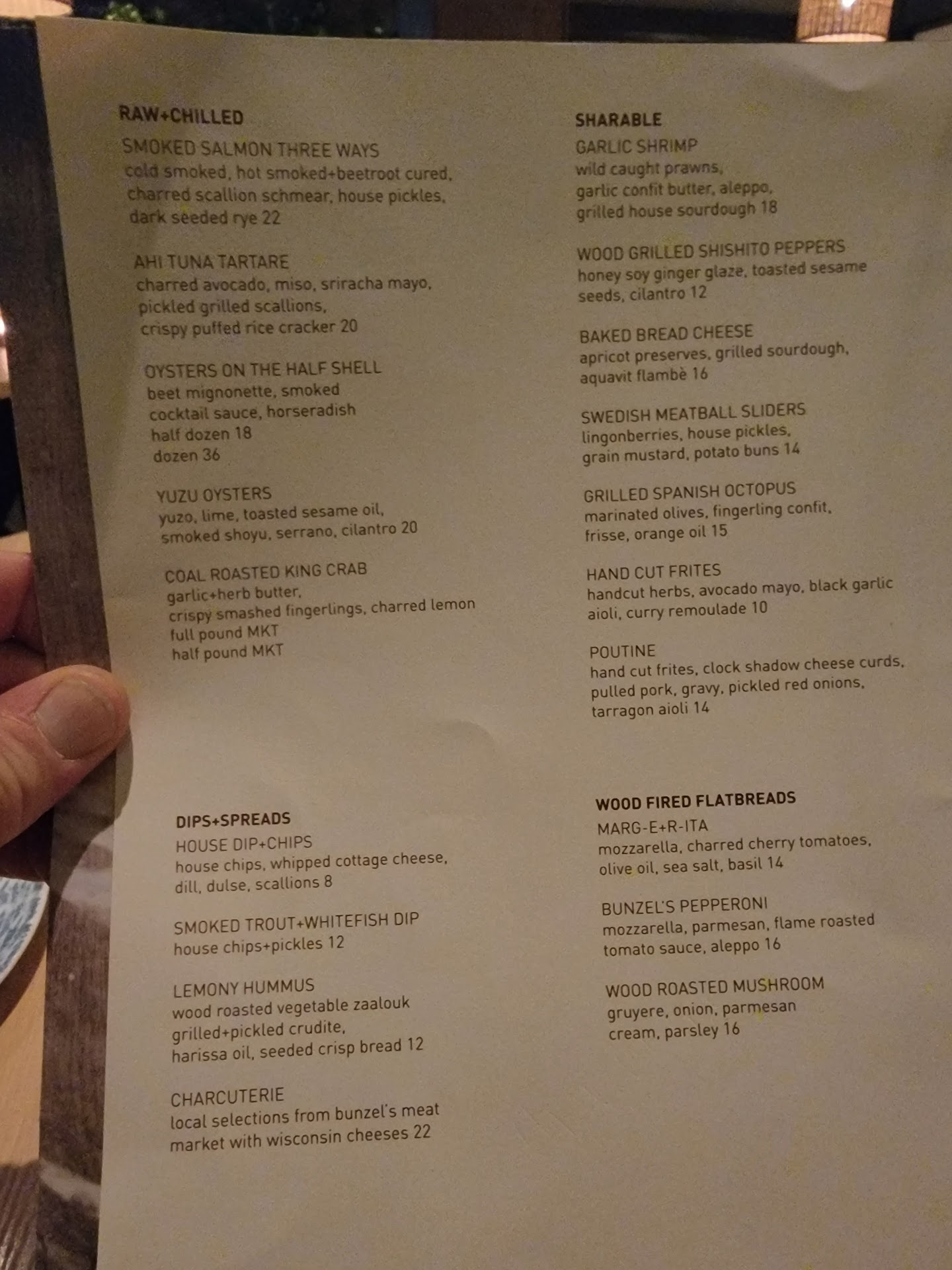 Read moreWe arrived at 650pm...had reservations at 7pm. We were not even properly greeted...guy just said....can I help you...no Hello! Welcome or nothing! I think you could fair much better with a better more enthusiastic host/hostess! First impressions mean a lot and should be expected for a place like this! We were "told" to go to the bar and wait...?? I asked for a glass of Moscato and was told they didn't serve it.. um ok? Anyway it was 715 when hubby finally went to the host and reminded him we had reservations at 7....he said our table was ready now. Our booth was very nice and cozy with pillows which was fun! The atmosphere and smell of the Wood fire is very very nice. We ordered another drink....amazingly tho... now they had Moscato...? How very odd! Anyway...ordered the charcuterie board...$22.. there was no fruit like grapes or anything or nuts either... Service was still very slow but we tried not to mind and just enjoy the atmosphere. We finally ordered...we ordered a $42 filet and hubby ordered the Tomohawk steak. It was a very very long wait....we finally noticed his steak sitting up by the kitchen warmer waiting to be picked up and delivered to us....it sat there forever...finally she delivered our food.. and low and behold it's cold...a $115 steak...cold...so we called over the waitress and told her it was cold so she took it back and apparently the chef warmed it up.. but..now a med rare $115 steak just went to a dry medium steak...with no flavor. My hubby was so excited to come here for his bday.....which was also noted on our reservations...so...the whole experience was pretty disheartening. When I asked to speak to the manager he apologized but tried to blame it on a glitch you were having that night with your computer system...? Seriously? Sorry...but when you send food back it's not because of a glitch in a computer system! Not acceptable! That waitress should have been falling over it making sure it was warmed up and returned to the customer immediately! Instead she was no where to be found! We even saw the chef set it back under the warmer again! The waitress literally disappeared from site. Never came back to check on us after all of this! We finally had to waive her over to get the check.. adjusted of course for an inedible $115 steak! I hope this is a teaching moment....never blame "poor service" on a computer glitch and be more attentive to your customers especially if you consider yourselves a "high end " dining experience! If you want to use all those $$$ in your reviews please live up to the expectations and experiences the customer is going to assume! We won't be back....sorry.. 5 o'clock steakhouse is still #1...