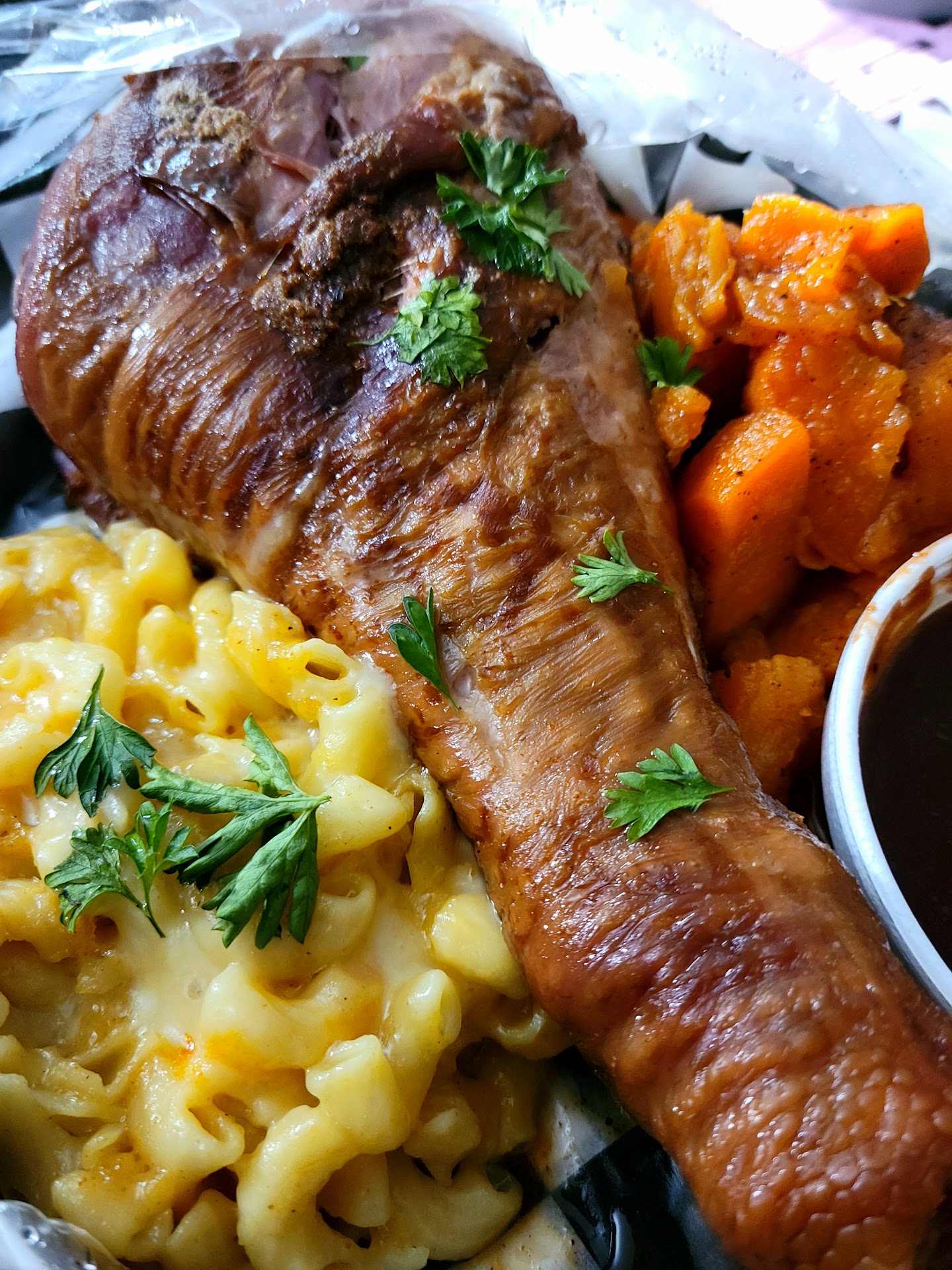 The turkey leg was so tender, it was literally falling off of the bone. It didn't really need bbq sauce, but since it was there we used it. Honestly, it would've tasted better with rice and gravy, that was also on the menu, as a side.