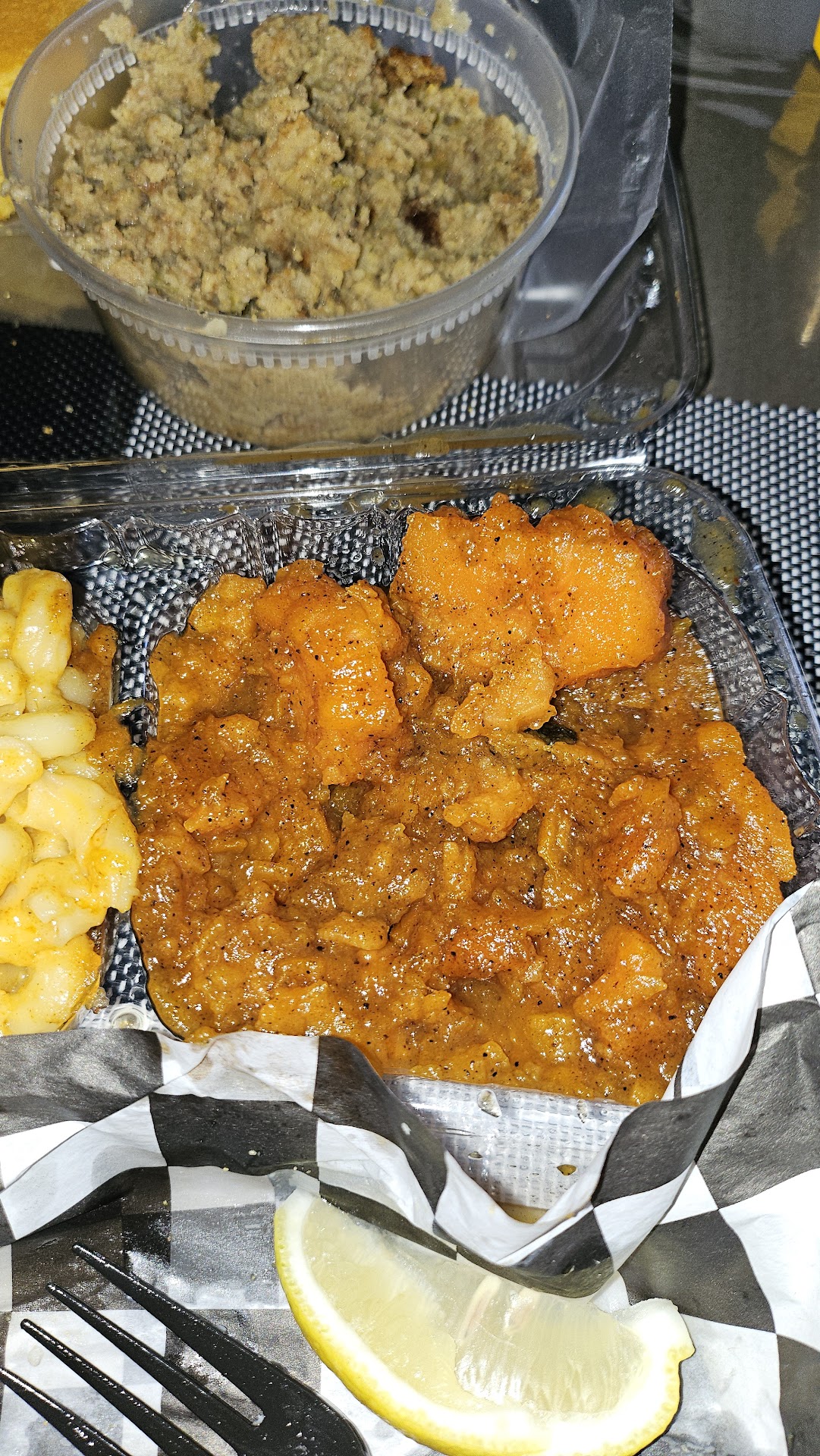 First tume trying this place out yesterday. I had the two piece catfish & two sides (mac& cheese & candied yams) & cornbread. Prices are kind of high,my meal was $26 & menu is very limited,not much to chose from. I tried called several times before going to place an order but no answer at all.So I get to the place the lot so small parking is very tight and everybody flying in & out like crazy I almost got hit.