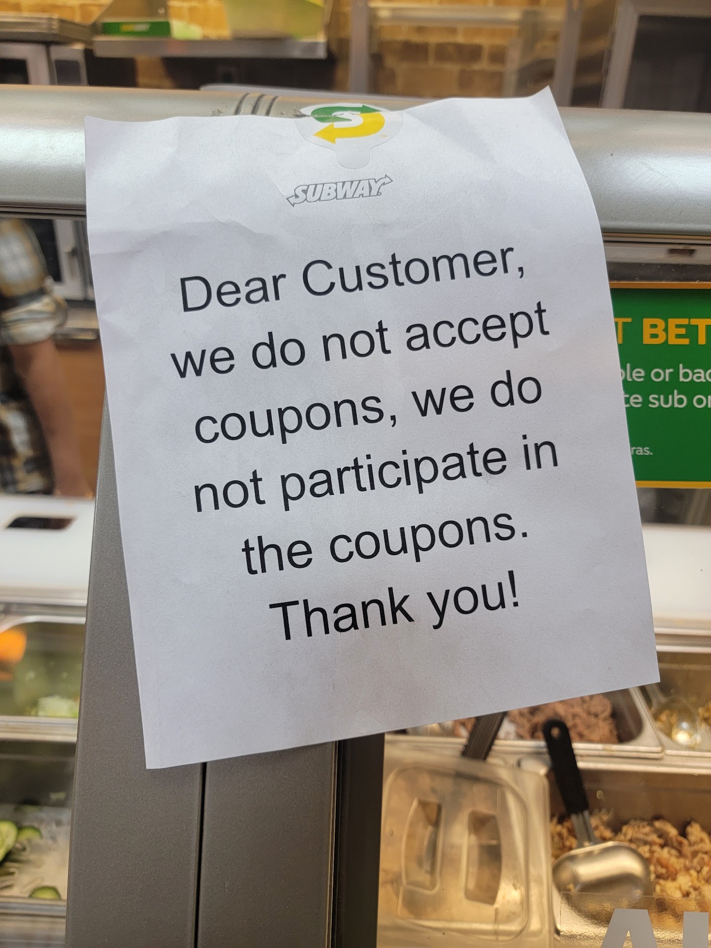 Read moreWe’ve been here more times than I can count since we moved to the area because it is close to our house and convenient. Lately, however, they have stopped honoring local coupons - if you bring in a “Get TWO footlongs for $11.99” coupon, for example, they will only allow you to use it on subs that cost $6.00 per footlong anyway. This location has lost our business due to this change, and we will encourage our friends to visit other locations to find better...