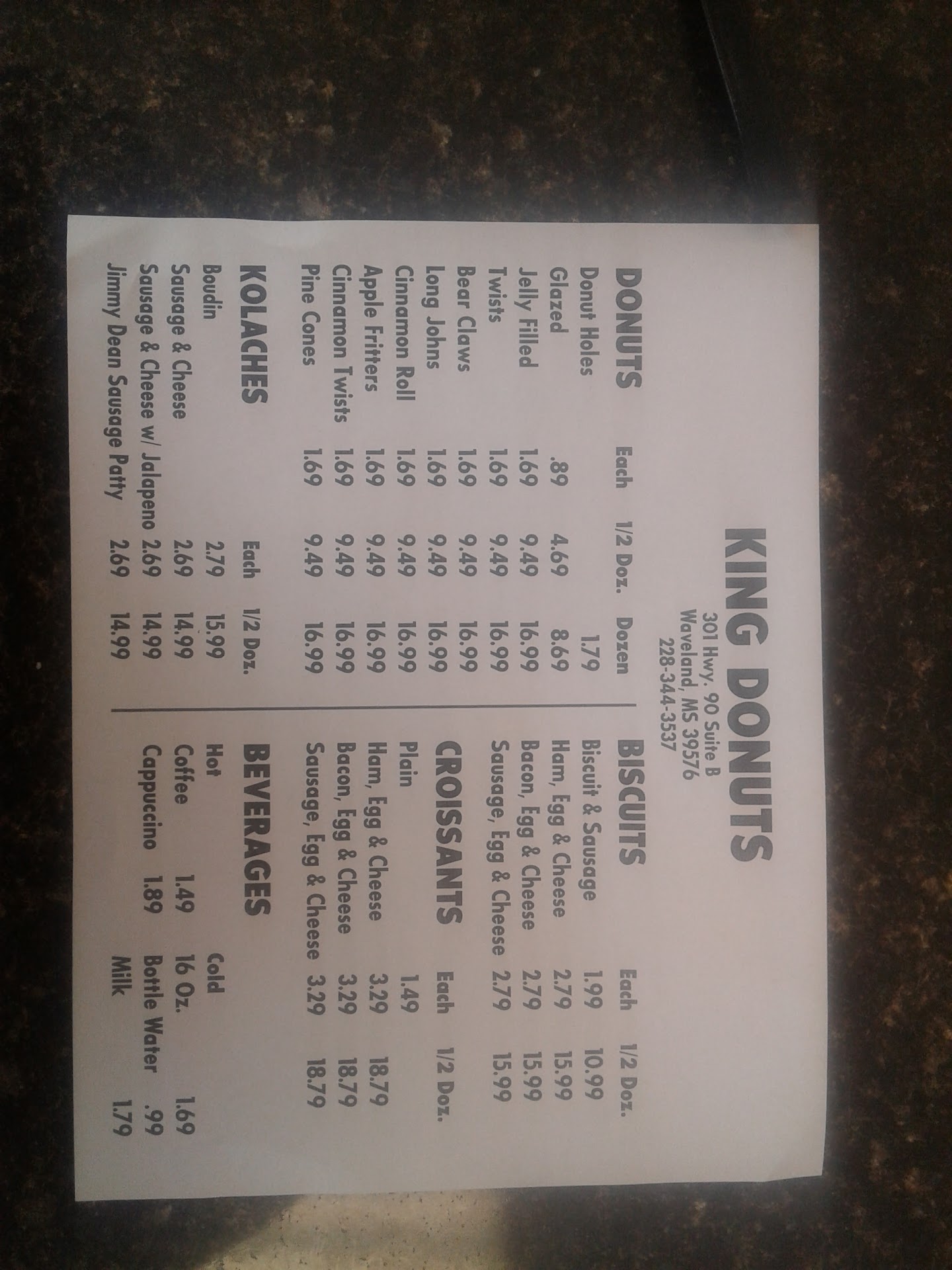 Read moreAll other donut places in the area pale in comparison to King Donuts. They are the king for a reason. They have the BEST apple fritters I have found anywhere. They're big, with a soft and moist interior, packed with apples, and the exterior has the perfect glaze and texture to balance with the interior. Also, I get a boudin kolache every morning. I've tried them elsewhere, and there is no comparison. The bread is so soft, airy, and buttery. And the staff is always friendly and welcoming. Never a dull day when I start it...