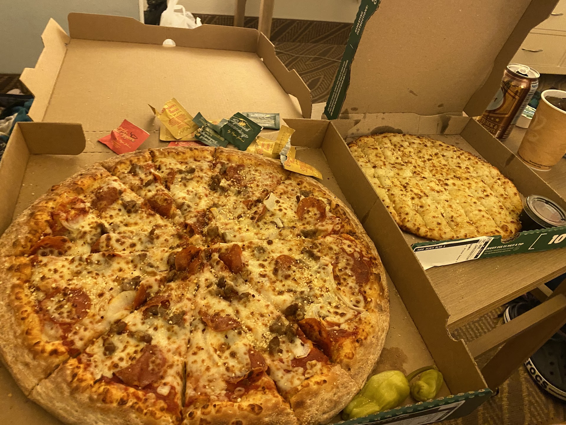 Papa johns is my favorite pizza chain out of all of them but this one location can not get organized well enough for me to enjoy it in my hometown. When they first opened it was hour long waits, app problems so you’d have to call in, for there phones to not work so you’d have to go in. To then be told they are out of only cheese pizza. I stayed away for a few months after that to let them get established since they were so new and the next time I ordered from them they gave away my food to someone else. So I had to stand there and wait for it to be remade. The third time I got it again the pizza looked bare. The fourth time I got it the garlic knots were once again given away to another person and I had to stand there while they remade my food again. This time it wasn’t a long wait and I got my garlic knots fast. But when she handed it to me the lid didn’t close which I thought was odd but figured they through in a few extra for my wait. When I got home they were HUGE garlic knots with raw dough in the middle. They tried to cook it to fast at a high temp. I called and the manager seemed to question if I was telling the truth. She issued the credit back to me so I could use it on another purchase later on. I wanted pizza the very next day so wanted to use the credit I was issued towards another pizza and they said it was impossible that I had to get the garlic knots again. Which is bad customer service bc if you made me raw food I’m not exactly gonna want that same thing the very next day. So I went up there to get my money back for the garlic knots and decided it’s the last time I’ll be ordering from this papa johns for a while until management is better. Not to mention they charge here for seasonings when every other papa johns it’s complimentary...