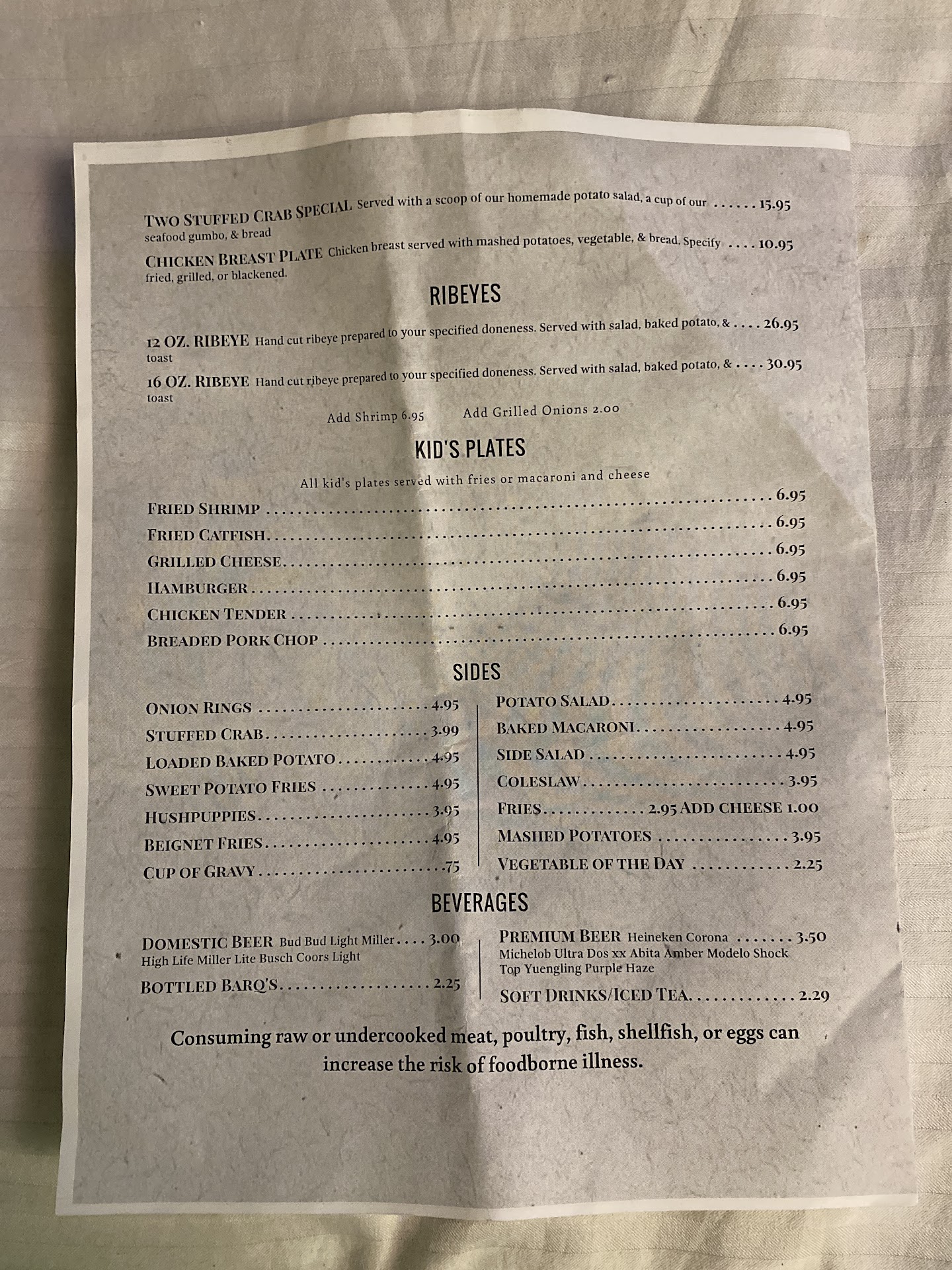 Another hidden gem! This place is great. The food is absolutely scrumptious. It is another one of those off the beaten path restaurants. It gives you that home town feeling for sure … On this particular evening, they had the very first batch of the year of boiled crawfish with potatoes and corn . Unfortunately, they were sold out when I got there so next time we’ll have to give them a try.. So instead got barbecue shrimp and let me tell you they were off the chain ! Also had their seafood gumbo which was homemade and from scratch, perfect melding of flavors. Also got a shrimp Poboy. The batter on the shrimp was light. The shrimp were cooked perfectly and yes, the bread was New Orleans style. Dinner was paired with a beer ice cold. What a great pairing. The wait staff will greet you with a smile and they are prompt and friendly and meet your needs. I will say if you are in Bay St. Louis or Waveland you must and I repeat must try this restaurant. You will not be disappointed by no means they do daily lunch specials also. Price is very reasonable also. The only downside is, they are not open seven days a week!!!!! You must catch them when they are open. Their hours of operation are Wednesday through Saturday 11 AM till 9pm but sometimes they may close early.. so check them out. Enjoy the food and better bring your appetite. You’re in for...