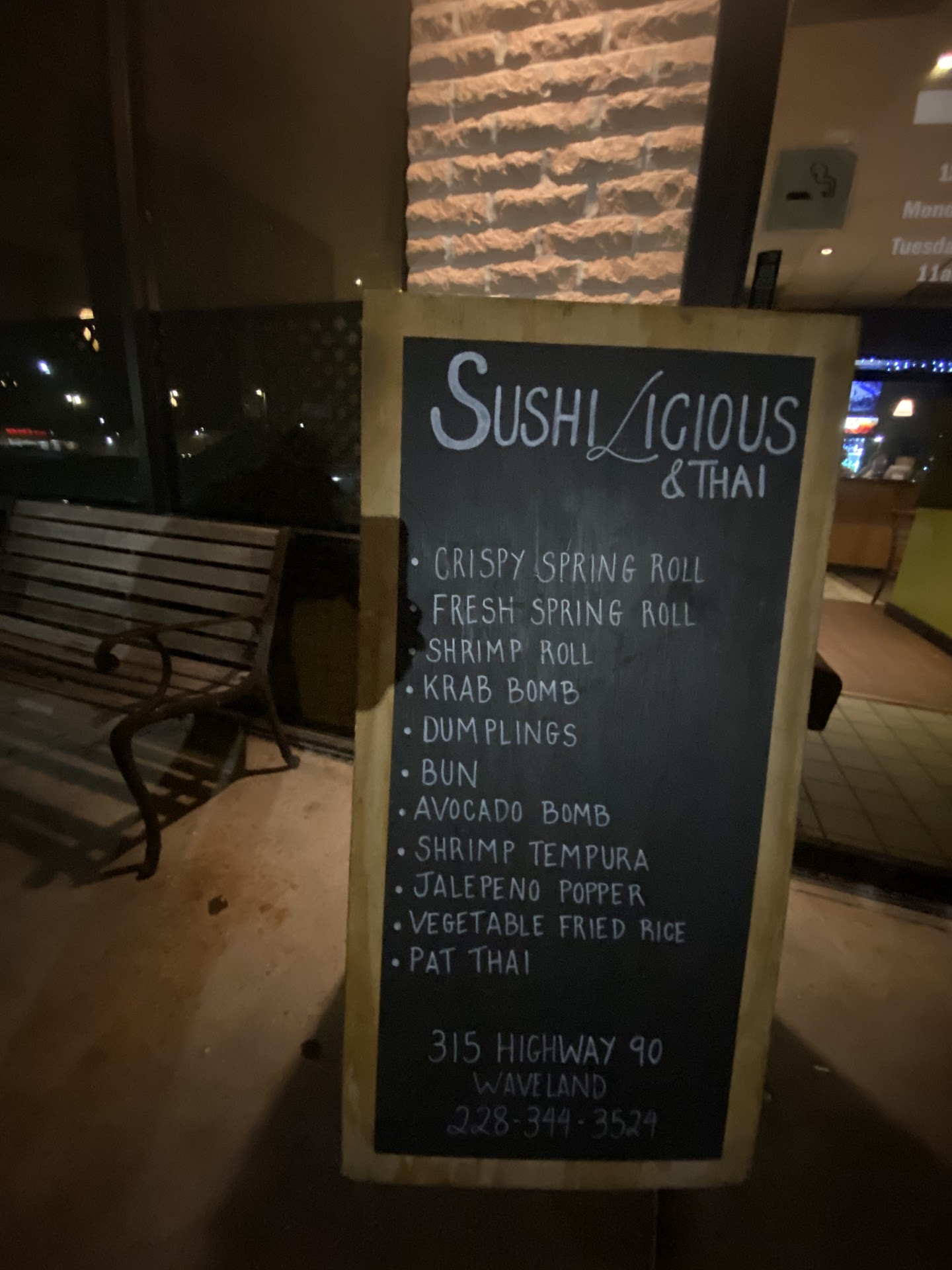 Read moreMichael makes THE BEST sushi on the coast! Pam is a phenomenal waitress! She never writes down an order and she never gets one wrong either. The atmosphere is mellow and laid back, comfortable and very relaxing. Food is served fast and to specs! The hurricane roll and a small tum yum soup is about $20 for both and you are full until the next meal time. I recommend spicy tum yum, it’s got heat, it’ll make you sweat, but you’re not downing sweet tea after sweet tea to cool it down. It’s literally JUST RIGHT if you like spicy food. They also have regular but I’ve always got it spicy! Great people, make you feel like family! Would recommend anyone and everyone to Sushilicious! I’ve been coming here for 3+ years and have NEVER had a bad experience or food I did not absolutely love! Family owned and run restaurant, you cannot beat that...