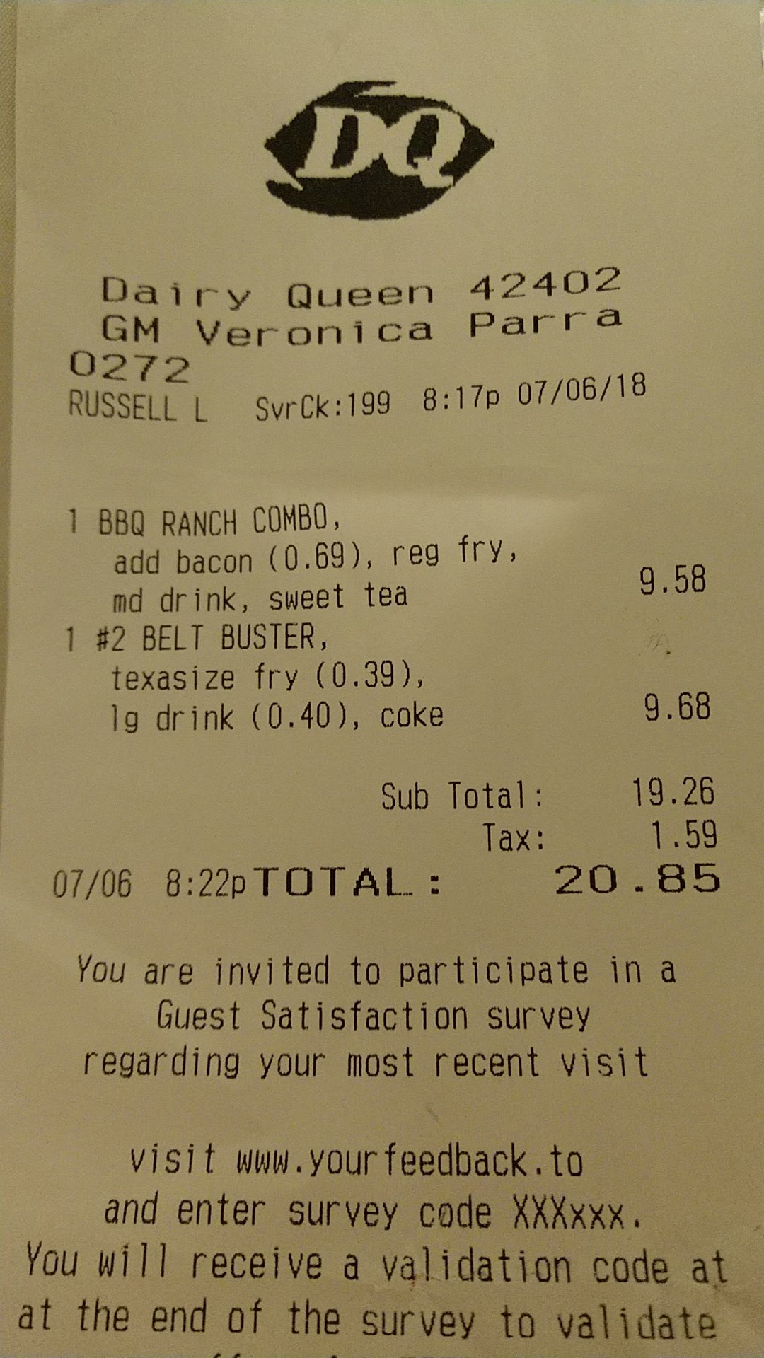 My husband and I stopped by Dairy Queen in Waxahachie to grab a quick bite for dinner. He ordered the #2 with cheese, no onions or tomatoes. I ordered the BBQ ranch burger and added bacon to it because oddly they didn't think it would be amazing with bacon. I asked for extra pickles too. Well the guy that took our order didn't repeat what we asked for and told us to pull up for the total. When we pulled up to the window there was a girl there who gave us the wrong receipt. We told her then she gave us the right one which came out to $20.85!!!!! We usually check our food before we leave the parking lot but we were so hungry we just wanted to get home and eat having faith it was all correct. Not to our surprise, the order was wrong as this location always messes up our order. My husband had tomatoes and onions on his burger and no cheese! We picked them off and added our own cheese. He said it didn't even taste that great. My burger wasn't amazing but it wasn't disgusting. I was so hungry I at it. They didn't add extra pickles on the order but there were more on my burger than my husbands.... I had to take the onion rings off because they got soggy and I took the top bunk off because it was like fresh dough squishing in my mouth. I just don't think we will ever eat there again. We may have ice cream there because it's good and they never mess that up. Really...