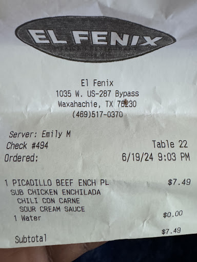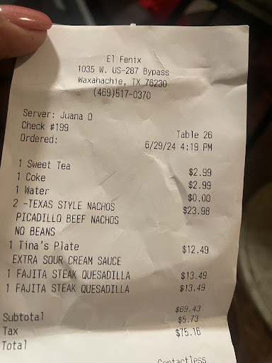 Read moreCan't express how DISAPPOINTED I AM. Today is my birthday and I chose to eat at one of my all-time favorite places. Service was slow but efficient. The food was excellent as always. We actually had a late lunch during Happy hour. I ordered 2 specialty margaritas (during Happy hour) at this point I'm going to say I do not and have not gone to a restaurant in quite sometime probably around a year year and a half. Its just not cost effective in today's ungodly prices but again today is my birthday so I chose El Fenix. Beside a the slow service (was really going to chalk that up to an off day but) when we got the check and I saw the margaritas were not happy hour prices I was a little surprised and asked for a manager so I asked her do you make it clear to your patrons what drinks are happy hour and which ones aren't? She said the waitress should have let me know. She the waitress did not. then I proceeded to tell her I would have never ordered what I did had I known it wasn't on Happy hour and honestly I've never a day in my life heard of restaurants putting some drinks on happy hour but not all drinks. To my surprise she did not even offer to take one of my drinks off my check. I will not be back to this location. I will definitely go to Dallas where the service speaks for itself. Oh and on the way out got a look at the return air vents and they are absolutely filthy. Be mindful of where you sit I would hate for a big old ball of dust to fall in your food. Just gross to say the least. I've worked in the restaurant business several times over my fifty six years and all of this is totally...