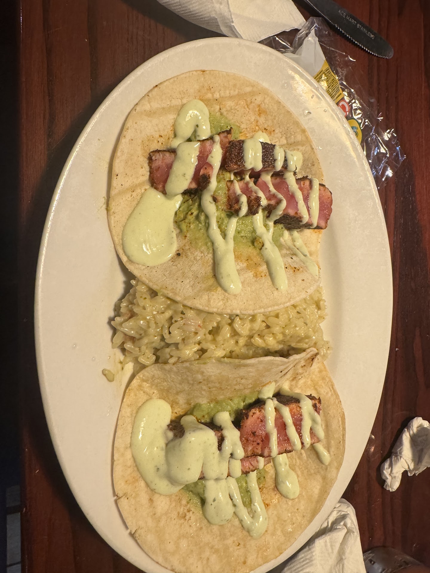 My wife had the blackened rainbow 🌈 trout, which she enjoyed (4-star). She said she would get it again. I had one of the blackboard specials, the surf & turf (steak and shrimp) quesadilla with black beans and rice. Also 4-star.