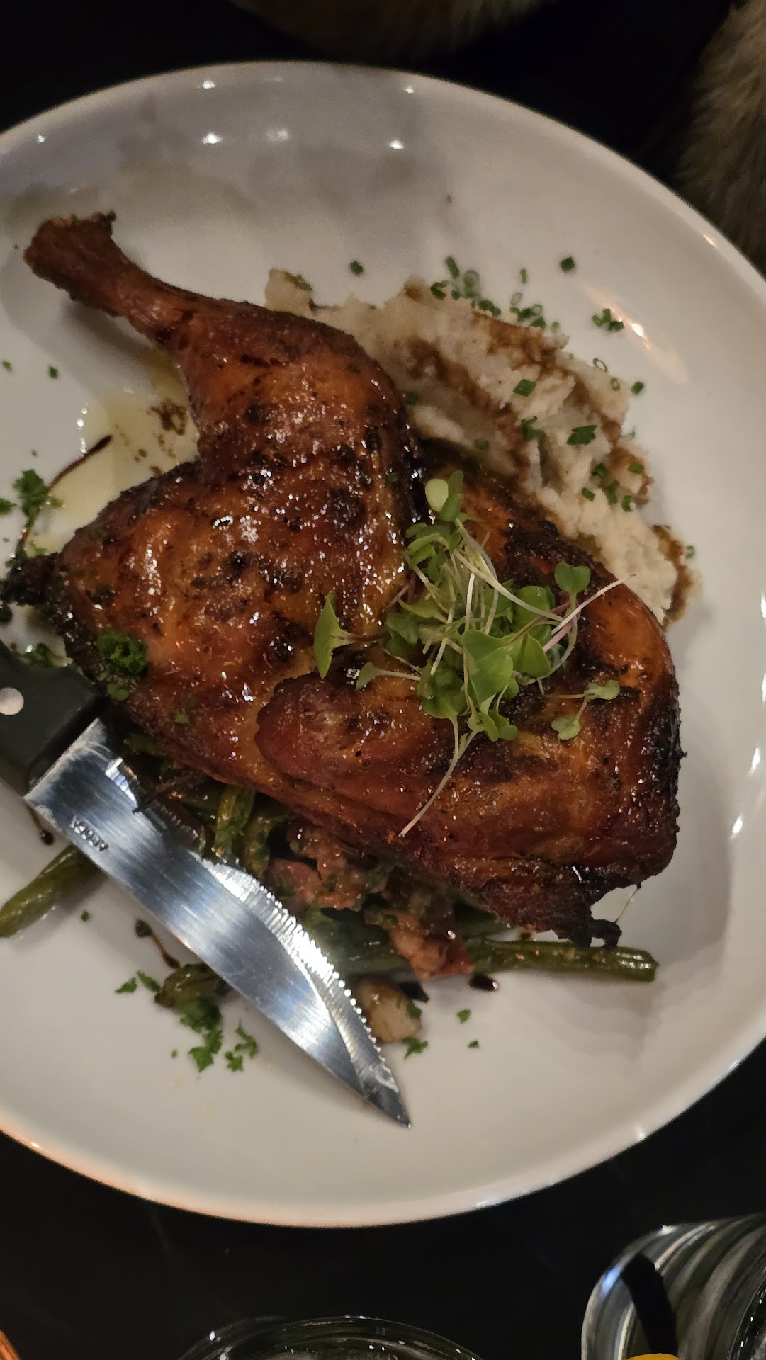 This place has a lot of potential, the vibe is great, and the bartender is slinging some quality cocktails. But disappointment your name was vegetable throughout this early evening dinner. We requested an order of fries as an appetizer and wile they were tossed in a nice little seasoning they were undercooked, and is there anything more disappointing than an undercooked French fry? There is actually, and that is an undercooked Brussels sprout which is what we found accompanying our (delicious and well seasoned) pork chop entree. They seemed to have been tossed in a warmish pan with their maple and bacon dressing, and with the vibe of the restaurant I was really expecting a classic deep fried sprout for that crisp and cooked texture, not that raw cabbage crunch. We added a side of green beans to our meal, and these too were VERY al dente. Which I generally like in a green bean but in addition to all the other lackluster veggies it just felt like another let down. The sweet potato mash was, fine. Perhaps a fluke, but with ALLL the veg being so mis-prepared I donāt think there will be a...