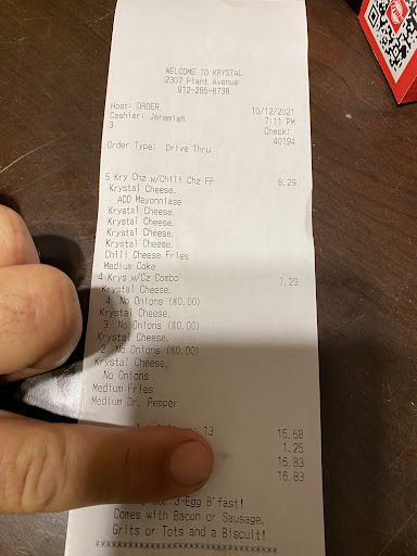 Read moreMy husband had to ask for someone to clean the table we sat at. Then had to ask for a napkin to dry the table. When our order came the kid behind the counter called my husband as he was coming back from the restroom that our order was ready as he was handing my husband the bag. When he got to the table with our food my chilli cheese dog was at the bottom of the bag upside down. And my husband's Krystal chicks were so hard he could barely chew them . In the end he had to take the crust off of them so he could eat them. I ask the kid that took our order who the manager was and he said he was. It was 4:30 in the afternoon. When I ask him who was over him he proceeded to tell me that he didn't know. Nor did he know how to get in touch with a manager. I've been trying to call Krystal since that day one day for 3 hours and all I get is a busy signal. Beings the inside was empty except for me and my husband and I can't believe the drive through is that busy that the phone is always giving me a busy signal. Someone needs to call me so we can get this...