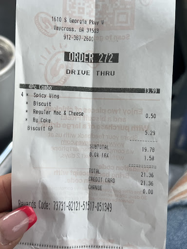 Read moreOkay, I had to edit my old review and speak on this most recent trip at this Popeyes to warn y'all, do not go there! It is not just the quality of food now, but now they're stealing your money and not giving you the food you paid for. I went here to purchase food for family because I don't eat from Popeyes in Waycross GA, it came to almost $40..Now mind you, the little girl taking the order in drive through didn't tell me they had no biscuits, smh. Yet still took my order and waited till I got to the window to tell me. Only to then say they would give us strawberry biscuits...she pulled my car up and I sat 15 minutes before she came out to tell us it will be 4 minutes on our chicken but we just seen 5 cars get food and pull off. Okay, at this point I was like I'm just gonna wait but they didn't come out in 4 minutes, it was over 15...all together I sat in that drive through 45 minutes, I kid you not. They sent the food out by the cook who I told to let the manager know I would be contacting cooperate...I checked my bag, food was still missing, didn't give us drinks that came with the meals...so I went in and confronted the so called manager who I don't think was the manager. Only for him to say they don't even have strawberry biscuits, smh...like what?!!!! They didn't have cups either, clearly... You've been warned, they never have...