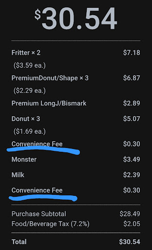 Scummy. 30 bucks for 10 doughnuts and 2 drinks...didn't need additional fees and the joke of being asked for a tip. Will...