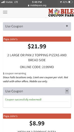Read moreSo I tried calling in an order for my family to buy this deal from Papa Johns on S Marion - the person refused to allow us to do it over the phone saying it’s an online coupon only- so we go to the website. In a rush we are hoping to grab it on the way home. The website is not allowing us to use the coupon. We stopped by the building and the rep refused to allow us to use the coupon saying their deals are on the website however we paid for these coupons - the rep also then stated it has to be expired. I point out that it doesn’t expire until June of 2022. I pleaded with him to accept the coupon and he refused. This is insanity-I paid for these coupons and you are denying for me to use them. I cannot rate it any lower. I’m so...