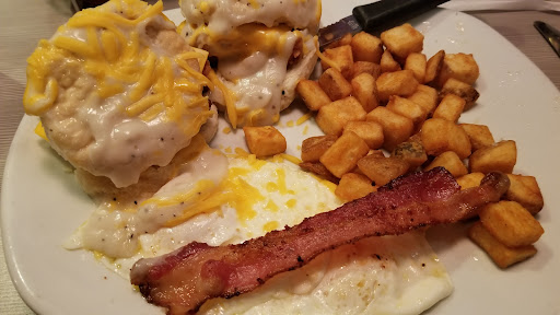 The food came out of the kitchen in three "waves" that were about eight minutes apart. The first people in our group to get their food were half done, or more, with their meals by the time the final plates were delivered. I ordered the Southern Fried Chicken Biscuit Breakfast. I'm quite positive the chicken was nothing more than one small chicken tender split between the two biscuits on the plate. I cut the first biscuit in half only to find not even a scrap of breading in the one entire half. At least one quarter of the second biscuit shared the same lack of chicken. The shining star on the plate was the breakfast fries. They were crispy...