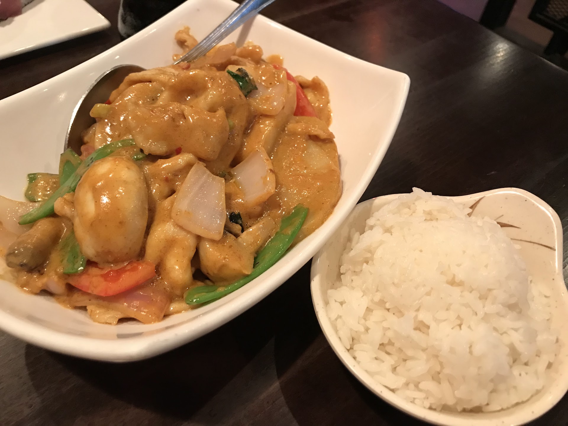 Here's the reason. Keep in mind that this is very personal and subjective. I ordered the Panang Curry with chicken. The lunch dish came with soup (or salad) and a choice of either white or brown rice.