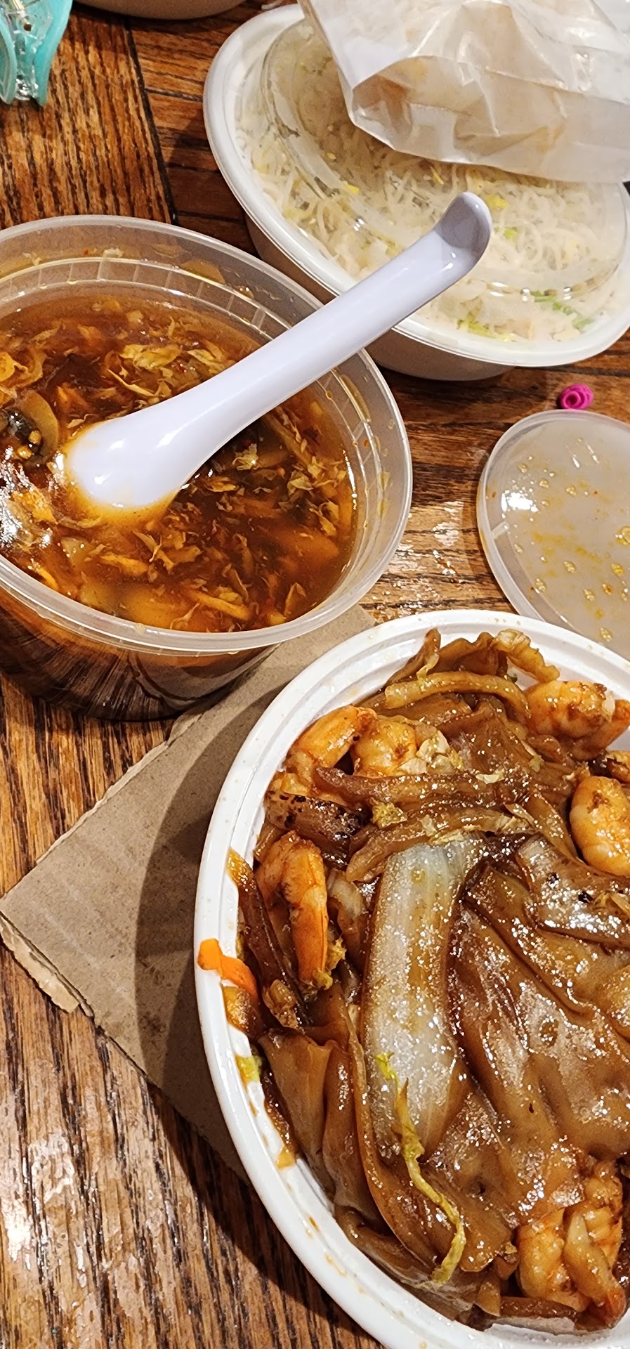 The hot and sour soup was very tasty, loved the fried wonton wrappers rather than the prepackaged crispy noodles. My husband got the Singapore chow Mai fun, my 3 year old got chicken Chow Mai fun and I got shrimp chow fun. Now, normally, it's very hard to get my daughter to finish her 1st helping but she loved her noodles so much that she asked for a 2nd helping and finished that! My husband refused to share his noodles, a very good indication thatvhe loved it. My chow fun was the perfect texture. Lots of places don't have good quality chow fun noodles but this place had delicious and chewy noodles.