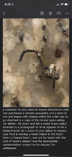 Read moreBELOW IS ATTACHED PICTURES OF WHY I DONT CONSIDER YOU TO EAT HERE !! I would give a 0 star if i could !!!!!!!! Honestly the worst customer service ever i went to buy a chicken quesadilla and a bowl of rice and beans with chicken come to find out while im eating i find a metal bracket in my food !!! Gods honest truth on top of me finding this i almost died if i didnt chew before i swallowed my food i spent 20$ on two things i chipped my tooth while biting on the metal bracket luckily im alive and my chip tooth wasn't to bad or i wouldve sued honestly any one that gets food from here needs to INSPECT THERE FOOD THROUGHLY !! I wont be eating at qdoba at all !!! And the reason why i couldnt sue is because my lawyer told me it wouldnt be a case since i dont have bodily injury but im leaving this review to make it aware that qdoba does not inspect there food and you should go else where !! To eat !!!!...