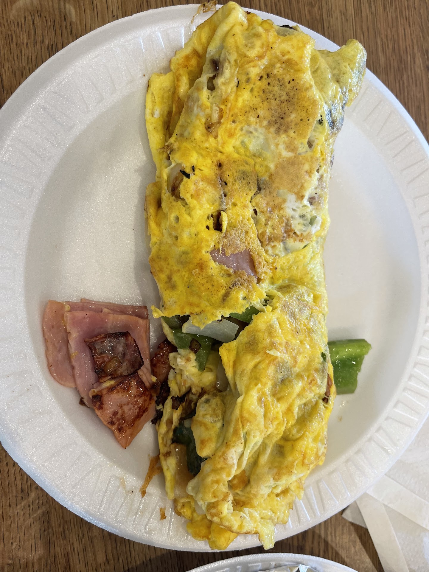 The Western Omelet is made with 3 eggs and includes your choice of cheese, which I chose cheddar. Served with a bagel or toast and these absolutely delicious home fries. My only complaint was that the toast was not buttered. The omelet is so big, that I couldnât finish it. Itâs truly enough for 2 people. The potatoes are so good, but again, large portion, couldnât finish it. Best part, it was less than $8! Unheard of! So delicious, reasonable, huge portionâŚwhat more could you ask for?