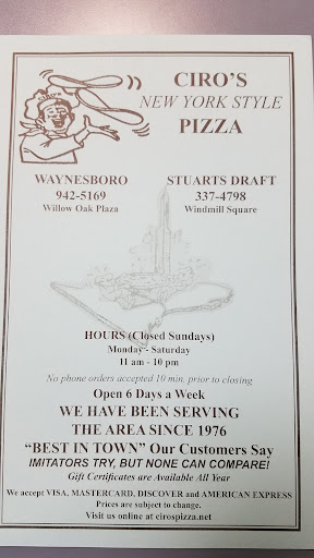 Read morecalled their Stuart's Draft store and ordered 2 steak and cheese special subs(usually really great), told it would be 20 min, arrived to pickup my order, and was told it'd be just a few more minutes, was curious cause store didn't seem very busy. After waiting in the store for another 20 min, (total of 40 minutes since I ordered) I inquired what was the delay, they said "oh, it's ready in just a few minutes". In 5 more minutes they called my number and presented me with a pizza...but I ordered 2 subs. They looked around, dumbfounded and said they didn't have an order for 2 subs anywhere, and no, I'm sorry or anything. I was disgusted at waiting so long, while the young men appeared to be playing around in the back room...that I turned around and walked out. WILL NEVER return to this store again....doesn't even deserve a #1 but you have to rate or you cannot comment. BTW, there is another Ciro's in Waynesboro, that I usually go to, and the food and service is ALWAYS OUTSTANDING, has been there since I first moved to town in 1978, never have been disappointed....this store could take lessons in customer...