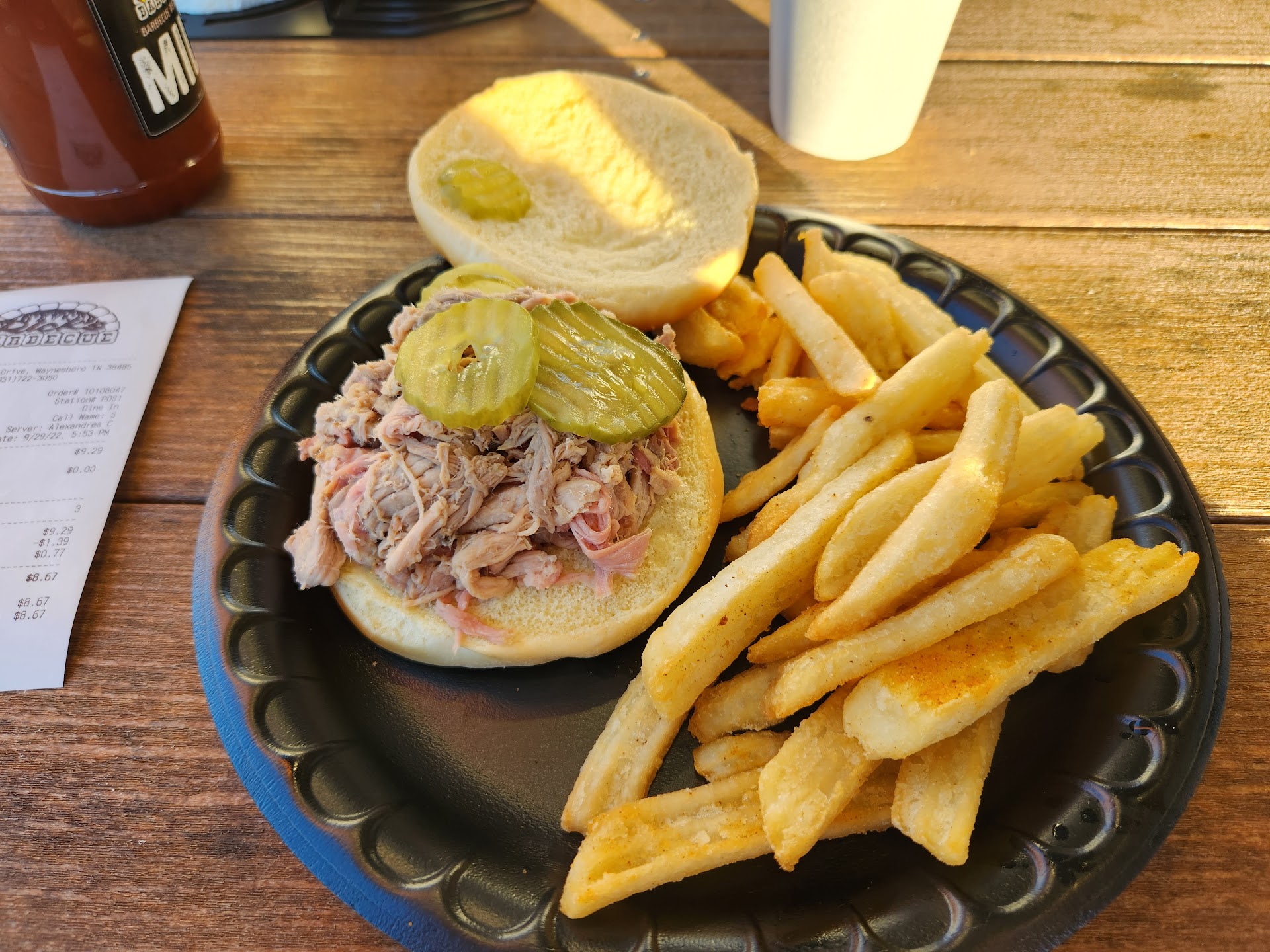 Ā Ā Ā Read moreA must for BBQ and, POTATOESā¦what? I asked our very pleasant server Hannah what the best sellers were and she said āour potatoes and our pulled pork, of course, since weāre a BBQ placeā. She then helped by explaining many different combinations. Typically I would go for the pulled pork sandwich, beans & slaw or potato salad: This time my husband was the one who got the pork sandwich, which was topped with slaw and he choose beans for his side & enjoyed. I just had to go for something including a potato . I chose the loaded potato skins which you could add meat to, so I got the pork on the side. The large skins were perfectly cooked (crispy edges) & loaded indeed with cheese, bacon & chives around a dollop of sour cream. Hannah even read my mind by suggesting ranch for dipping. My āmealā was delectable and very filling. My son got Mac and cheese with his kids meal and it was quite tasty as well. I put a bit of the Mac on a bun with the pork and I think they need to considering making it a menu item!