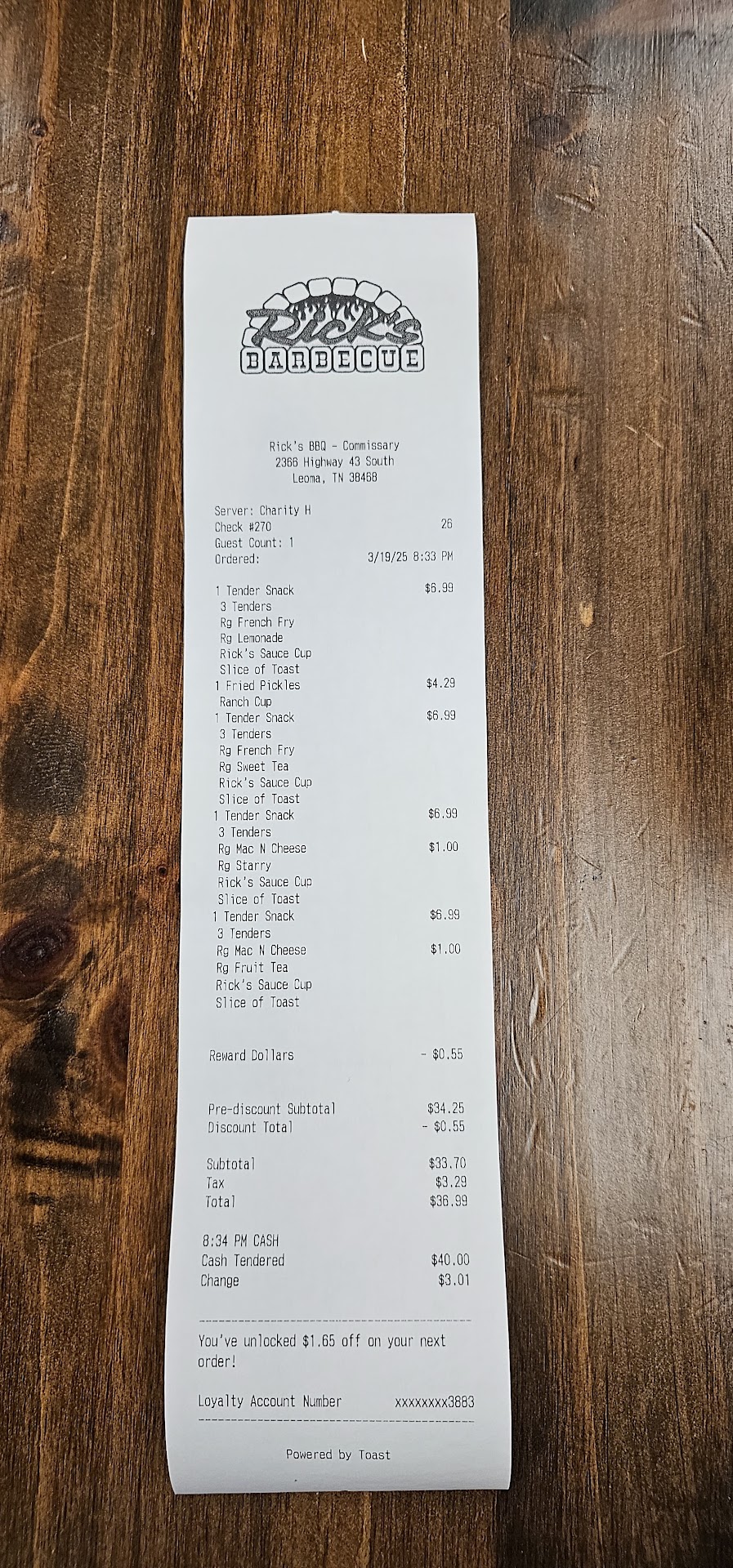 Disappointing Experience at Rickās Barbecue ā Poor Service & Cold Food We visited Rickās Barbecue in Waynesboro around 8:30 PM and placed our order at 8:34 PM (verified by the receipt). We waited until approximately 8:50 PM to receive our food, and unfortunately, the meals that included fries were cold. The chicken was fine, so we began eating, but the overall experience was already off to a bad start. As we ate, an employee was cleaning around us, and I politely asked if we could get fresh fries. She reluctantly agreed, but her facial expression showed clear annoyance. When the fries arrived, they were not only a bigger portion but also hot, which was an improvement. However, by that time, I had already noticed the toast was ice cold as well. I didnāt bother mentioning it, as I didnāt want to cause further tension. By the time we finished our meal at 9:08 PM (just eight minutes after closing), I went to get a refill. From the time we arrived, the tea, fruit tea, and lemonade had been kept behind the counter, which made it a hassle to get refills. We had been able to get a few, but when we asked for one last refill before leaving, the employee simply said, "We already dumped them out." This was frustrating because rather than wasting good tea and lemonade, they could have offered it to customers beforehand. My son, who actually knows this employee personally, asked in surprise, "Are you for real?" to which she responded with a cold and dismissive "Yeah" in a hateful tone. At this point, we asked to speak to a manager. The employee hesitated but eventually brought out Carley from the back. Unfortunately, her response was just as dismissive. She repeatedly said, "I'm sorry, I'm sorry, I'm sorry" in a monotone voice without offering any solutions. I left my name and number with her, expecting to hear from upper management regarding our experience, but as of now, I have received no follow-up. To add to the frustration, we later noticed an upcharge of $1 per meal for substituting mac & cheese instead of friesāsomething that used to be allowed at no extra cost. We werenāt informed about this charge before ordering, and I only discovered it when reviewing the receipt. Ironically, as we walked to our car, we ran into a manager from the Lawrenceburg Rickās location. After explaining our experience, he agreed that it was unacceptable and apologized on behalf of the company. He also provided us with the district managerās name and mentioned that if we ever visited the Lawrenceburg location while he was working, he would take care of us. Overall, this visit was disappointing due to cold food, poor customer service, and a lack of professionalism from the staff. The fact that I left my contact information with the manager and have yet to hear from anyone only reinforces my dissatisfaction. While the interaction with the Lawrenceburg manager was a bright spot, I cannot recommend this particular Rickās location based on our experience. Furthermore, I expect better from a company that promotes itself as being Christian owned business. Values such as kindness, hospitality, and integrity should be reflected in every location, yet this experience did not align with...