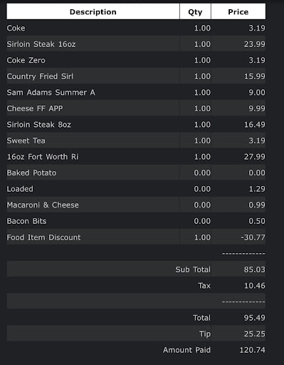 One other in my party ordered a medium rare 16 oz sirloin. It arrived looking like a piece of leather - well done with zero pink and the cut was thin and flat. It didnât look appetizing. The replacement steak looked better and was cooked correctly.