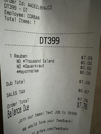 Read moreOrdered turkey bacon ranch wrap combo in drive thur. Got the wrong wrap went back just to get my money back. The guy that helped me told manager that I wanted money back. Manager never came and guy tried to give money back but after trying he asked if they could just make me a new wrap. Because he didn't know how to return money. I said if I can't get my money back I guess I don't have a choice. He yelled at manager to make my wrap. Got it went home and it was still wrong. Had honey mustard instead of ranch. And very flat wrap with to thick cut of meat. As I was standing there I could see under the fryers and there is alot of old food under them. It wasn't that clean. Arbys have went way down hill. Probably...