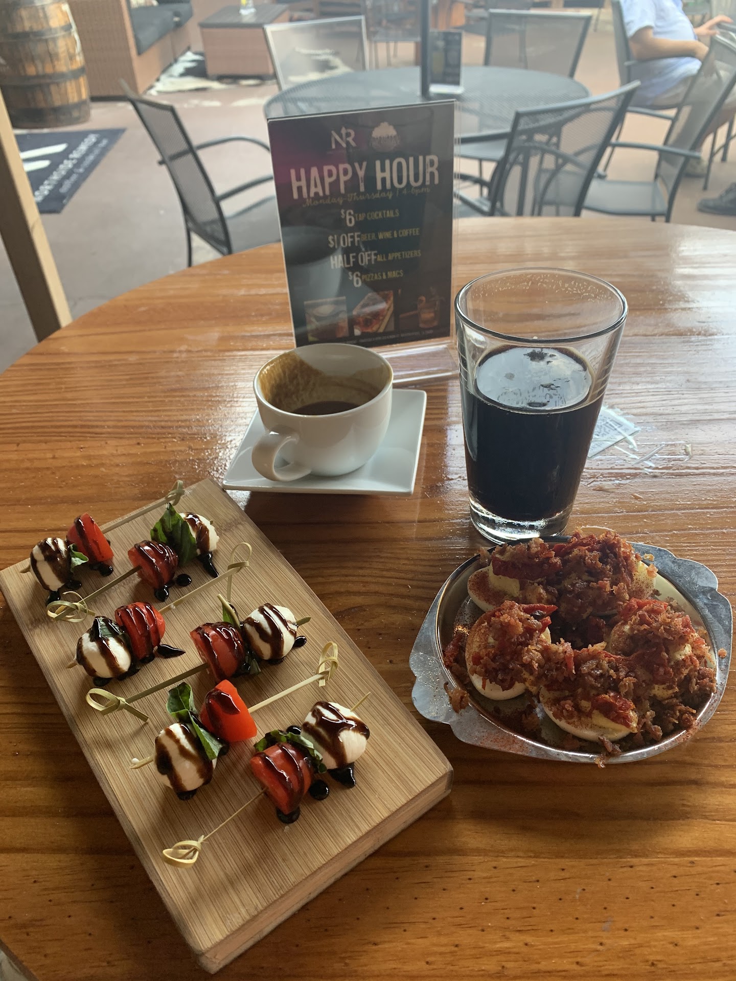 Before walking away with our beverages, we decided to try out a few of the Appetizers. A Caprese Skewer, and an order of Deviled eggs yum!!