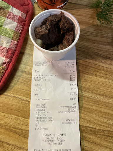 Read moreBefore we moved to Weatherford, Rosa's was one of our family's go to restaurants for fast Tex-Mex. However, this location has proven to be a growing disappointment with each visit. Burritos that fall apart instantly, undercooked meat, and especially their cheap attitude towards à la carte offerings. We used to enjoy ordering the fajita meat by the ounce, as four ounces of meat for roughly four dollars was an excellent deal. Yet, here they claim that the four ounce weight is that of the container and use this excuse to give us only about two ounces of meat. I know this is not the case at other locations. The staff has been very unprofessional as well, and even though I prefer to give any minimum wage worker a fair amount of grace since I know how hard their jobs are, their continual condescending and arrogant behavior is hard to forgive. They often rush your through your order in the drive thru. Overall, we will...