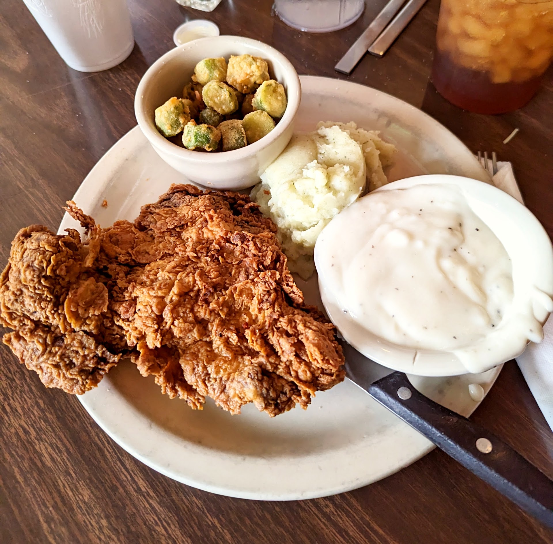 Read moreWe came here based on the high review, but I can’t imagine why it’s so high. The food was nothing extraordinary, nor was the service anything but standard. The ambience is nice and it’s a quaint sort of small town restaurant so it was a nice atmosphere. I had tomato soup, similar to canned Campbells, and it came with a packaged roll. My companion had a lunch plate, mixed vegetables, mashed potatoes and chicken fried steak, with the packaged roll. Again, pretty standard, not terrible and not amazing. The price was about right for the quality. There were many fried items on the menu. Hilarously enough, the first day we visited, the menu was quite sparse as their fryer had broken down, so choices were more limited. Despite the shortcomings, it was a much better choice value-wise than a restaurant a few doors down that was charging New York bistrot prices for Italian food. In conclusion, based on the other choices in this town, I would recommened this restaurant based on value and atmosphere. Just don’t expect to be amazed. (Not recommended for vegans or artery-conscious...