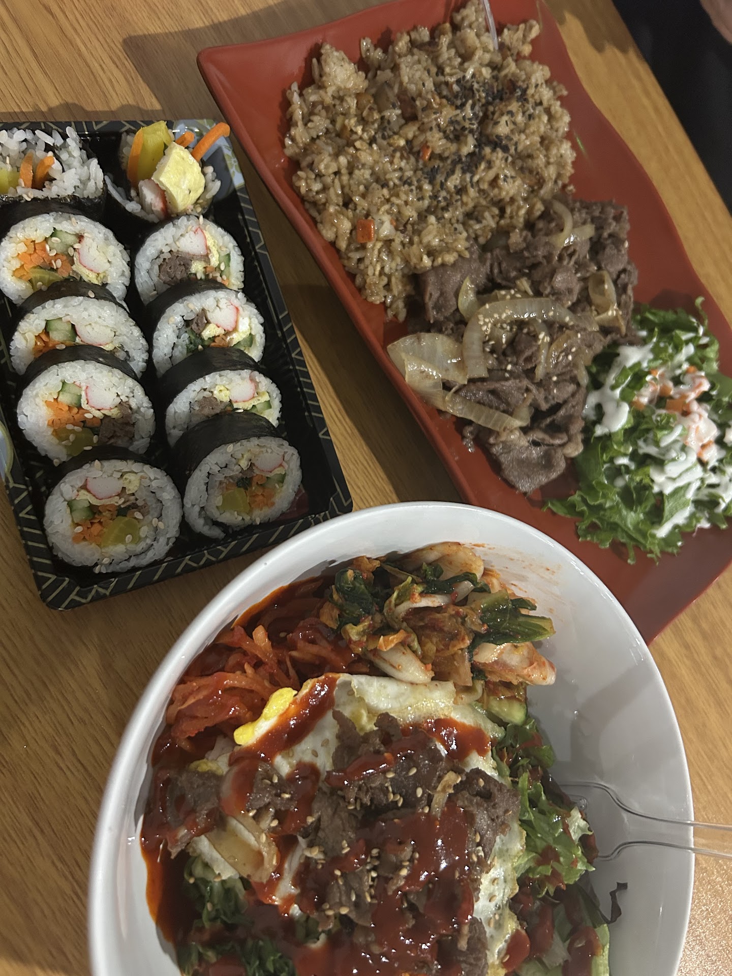 In the bowl is Spicy Bibimbap with kimchi The rolls are called Kimbob And the plate is Bulogi w/fried rice