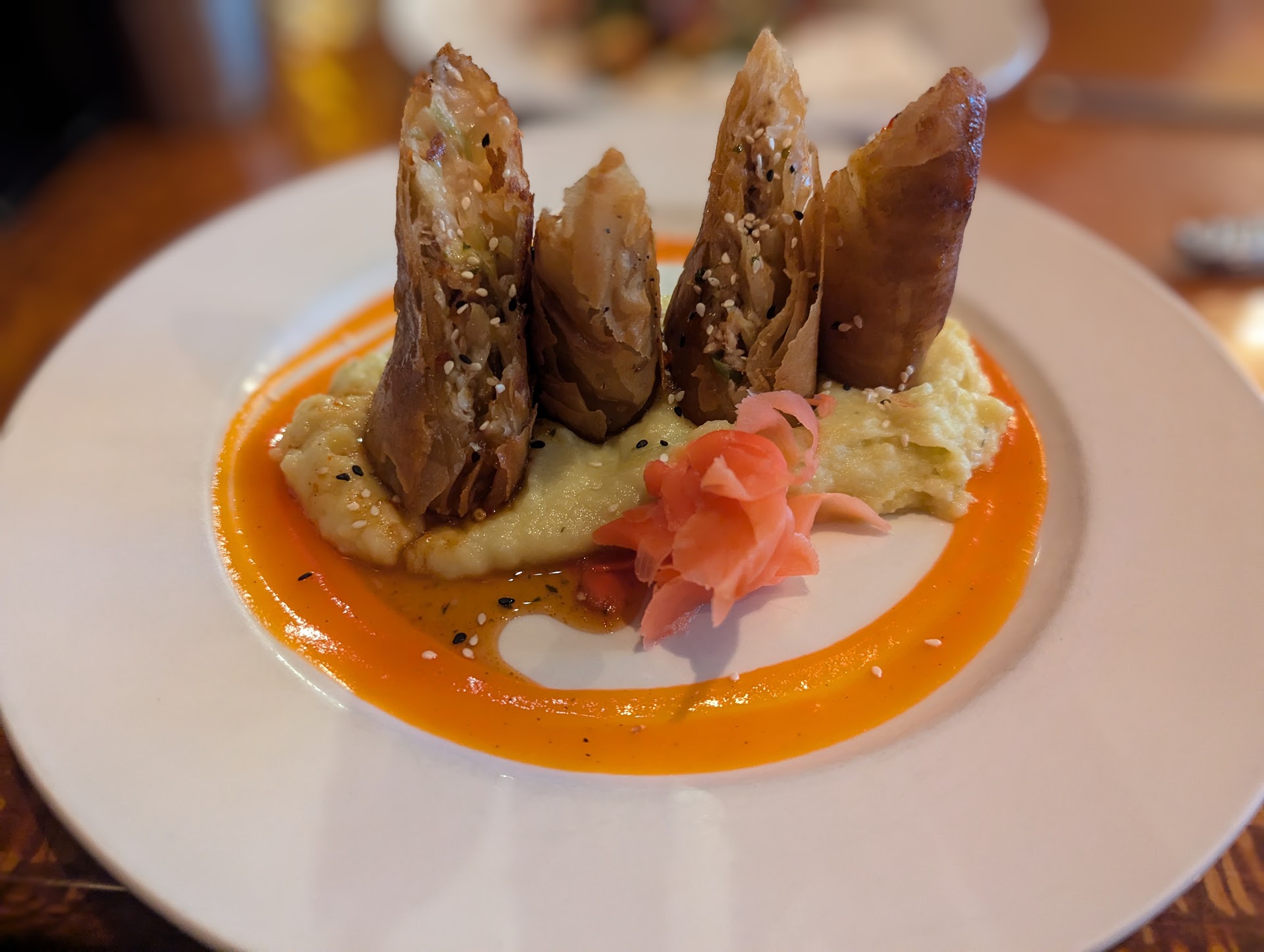 Egg rolls: they were ok I guess, but didn't arrive to the table hot. The steam from the mashed potatoes they were placed ontop of while they sat and cooled in the kitchen made them all wet and soggy so it seems like a poor plating choice if they wanted them to be crispy when you get them.