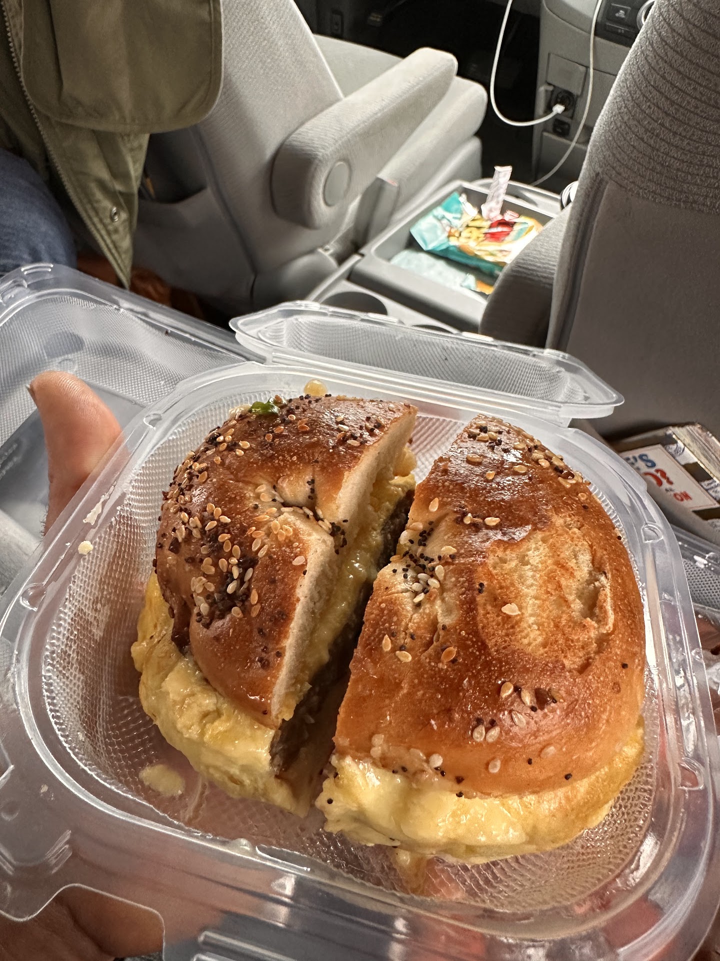 I got the sausage breakfast bagel on the everything bagel- one of the best I’ve ever had (and I’ve had quite a few!) the cheese, the sausage, the egg. Mmm! I also got the strawberry French toast- it was fine but I probably wouldn’t get it again, I’d just get the regular French toast perhaps. My latte was quite good, as was my wife’s lavender latte! We also got a cinnamon muffin thing- it was very good, though it had a strange texture and stuck to the roof of your mouth- once you get past the unusual texture (because it’s vegan and gluten free) it’s ones I’d the best cinnamon muffins we’ve had as well.