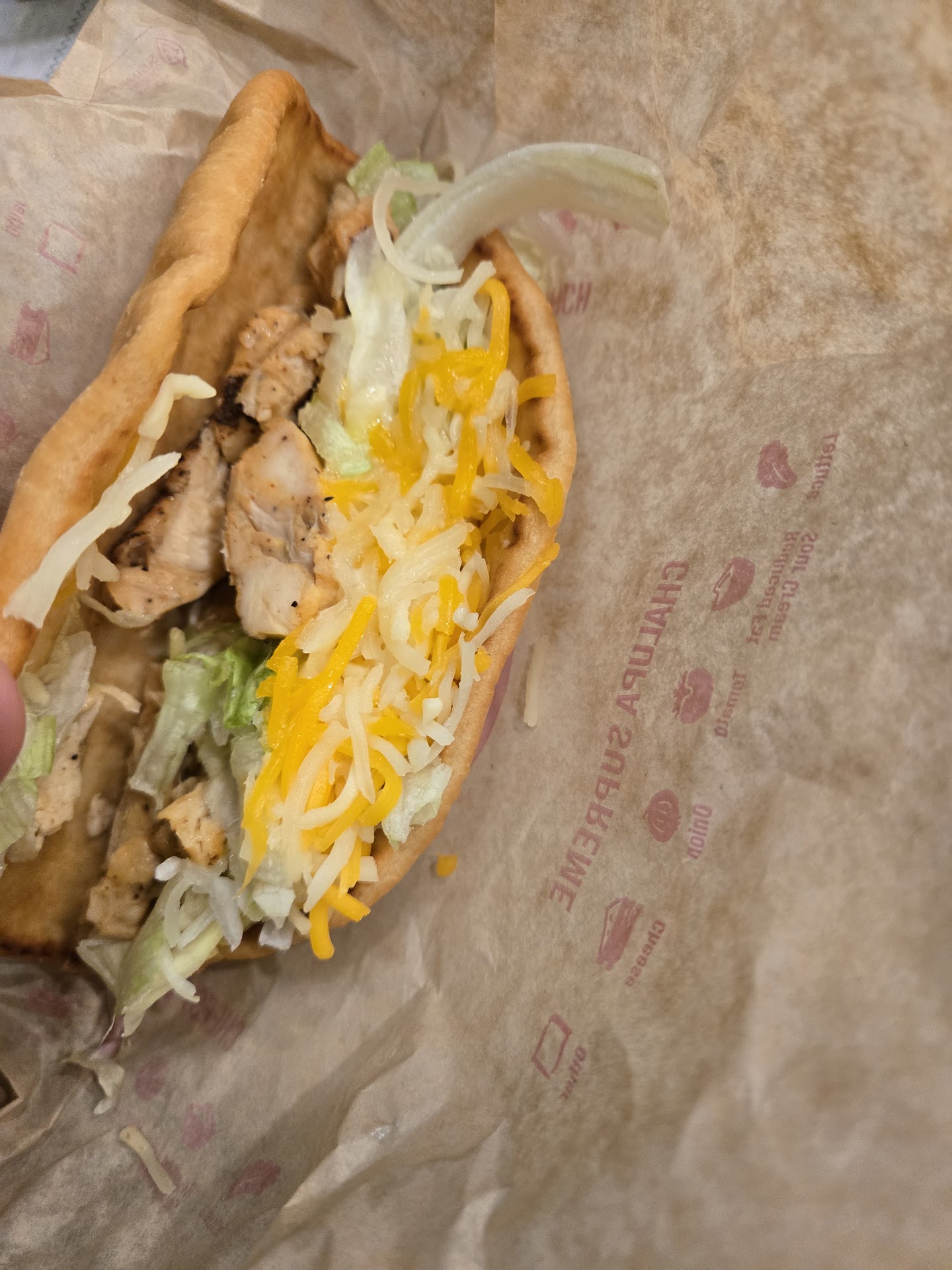 I went thru the drive thru and ordered their Taco salad and tried the mini shredded chicken and cheese quesadilla without the Chipotle sauce. Not a fan of hot sauce. But loved it. Really fresh and hot. The Taco Salad was really good too. I brought it home tho. So had to stick it in the microwave (I know, ugh). But it had been a very long day! Lol. It was still good and it warmed up the salsa, which wasn't too spicy... But would be better if it we're mild... Or offer a choice?! Anyway, it was still real good and filling. Plenty of it all. With beans, rice meat, lettuce, cheese and sour cream on top. The salsa was on the side. Perfect combination. And the put the rice and beans and meat separately so you might need to look for the bite you want, or stir it up. I say that as I didn't know it had any rice till I got a big bite. But was pleasantly surprised it was soft fresh white rice. And love the fluffy crispy shell, not hard and crunchy like a yellow corn taco shell. So there u have it. Have a great day....