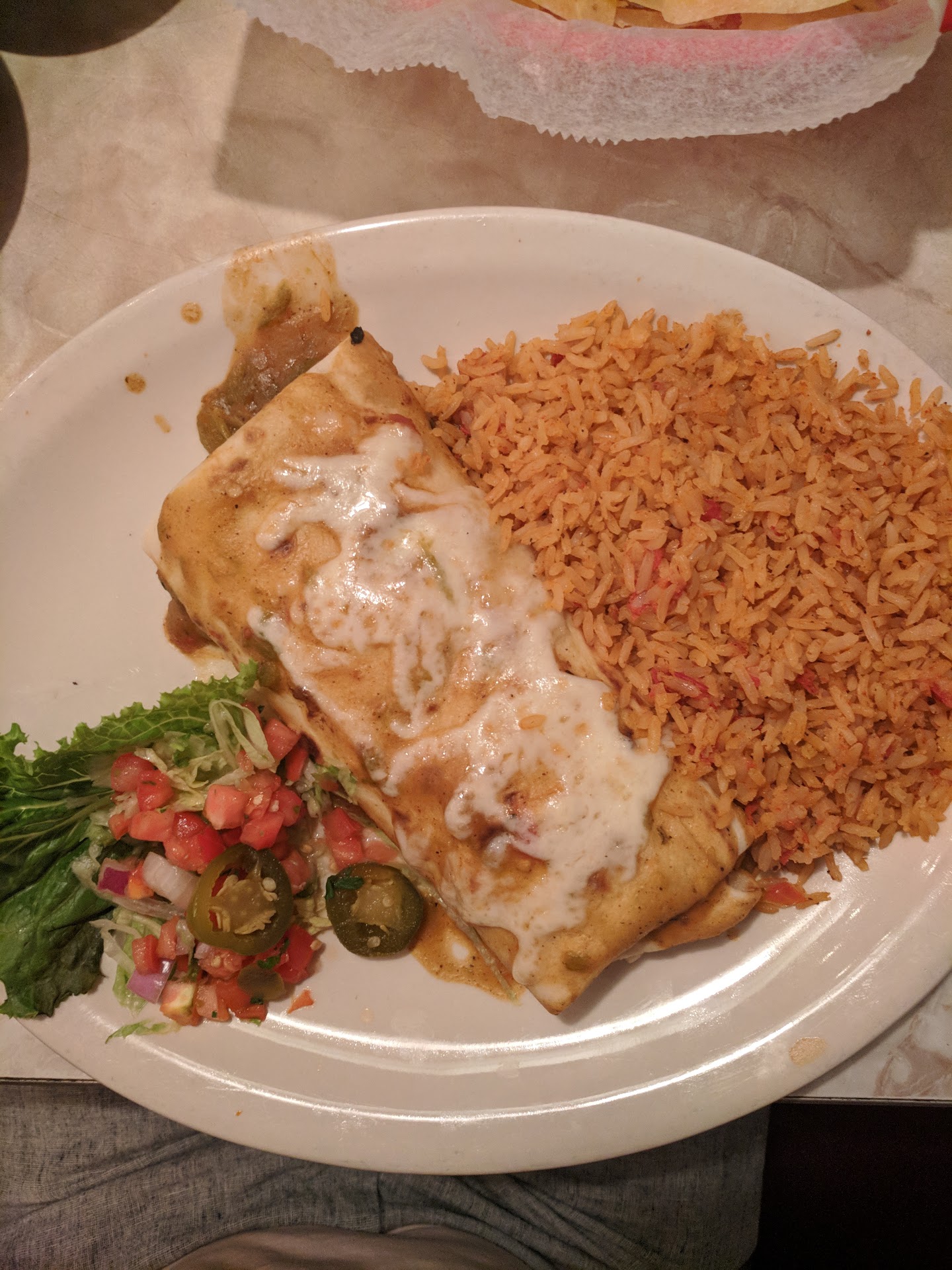 Food- on the whole ... no! Just no! The one shining star wad the taco- yummy! BUT, Salsa is chunky which I like but it was overpowered by jalapeno and cilantro. I love cilantro but there was way too heavy hand in making it. My friend did like the guacamole/sour cream dip but I found it revolting. The cheese enchilada was a doughy flour tortilla with what appeared to be shredded cheese melted in the middle. It was hard to tell though because you can barely find the cheese. The chili sauce was very dark and typically what some restaurants serve on tamales. The entire ensemble was just not good.