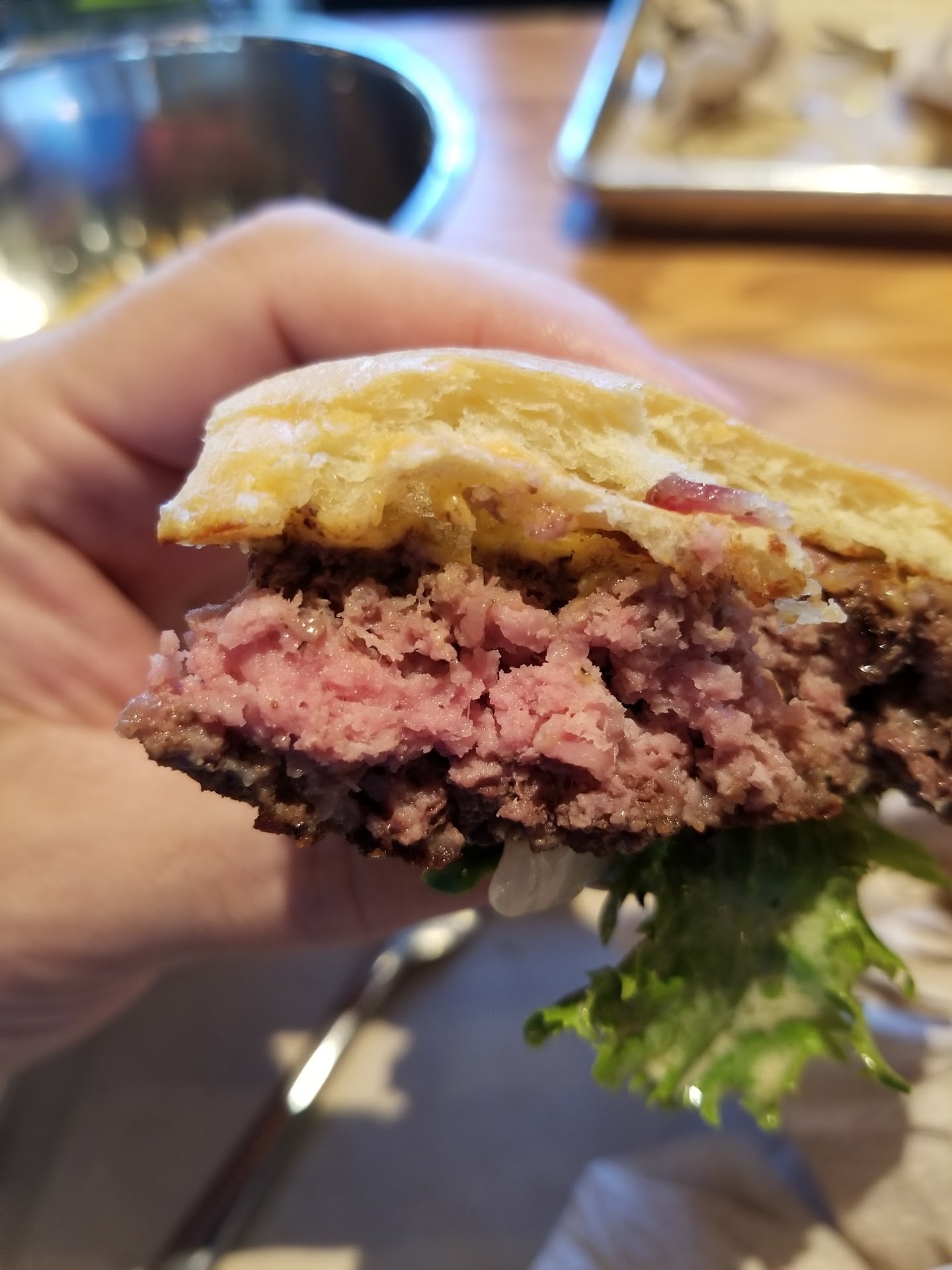When the food arrived, it was filled with a bowl of "flaked" brussels. Imagine the brussels being peeled into a pile of "leaves". They were probably flashed fried because they were a bit oily when I ate them. I didn't know at the time that you can dress them with other specialty toppings, like grated parm, blue cheese, etc. Even though I asked them to be plain, at the very least, they could have been salted. No worries, I asked for salt and pepper. My friend who is a burger aficionado and likes his food boiling hot, made no complaints about his burger and fries, so that is a great endorsement of this place also.