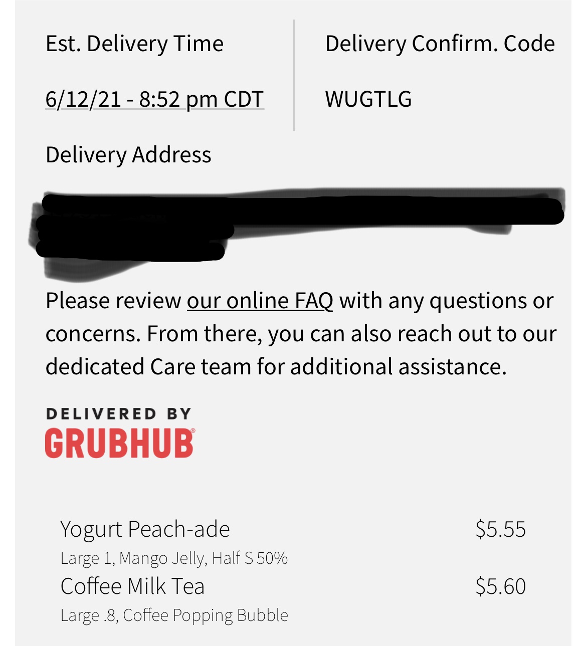 Read moreNormally have great experiences with this place. If I order for delivery, they generally call to let me know they're out of something I ordered so we can arrange for a sub. Lately, however, has been frustratingly bad. One order just never arrived--that's a GrubHub issue, the worst of the delivery services, but that is a rant for another time. This time, both drinks in my order had something wrong and that's on this location. One drink was completely wrong leading me to believe that they mixed up the drinks in someone else's order. The other drink was made incorrectly with different toppings added. If this was an issue with being out of things, then call, as they have done in the past. But this time they just threw some toppings in and called it a day. I would have rather no toppings and miss out on the 50 cent surcharge than this abominable mix of toppings they added. I'll give them one more try, because they're normally pretty great, but will definitely not be using for delivery until they...