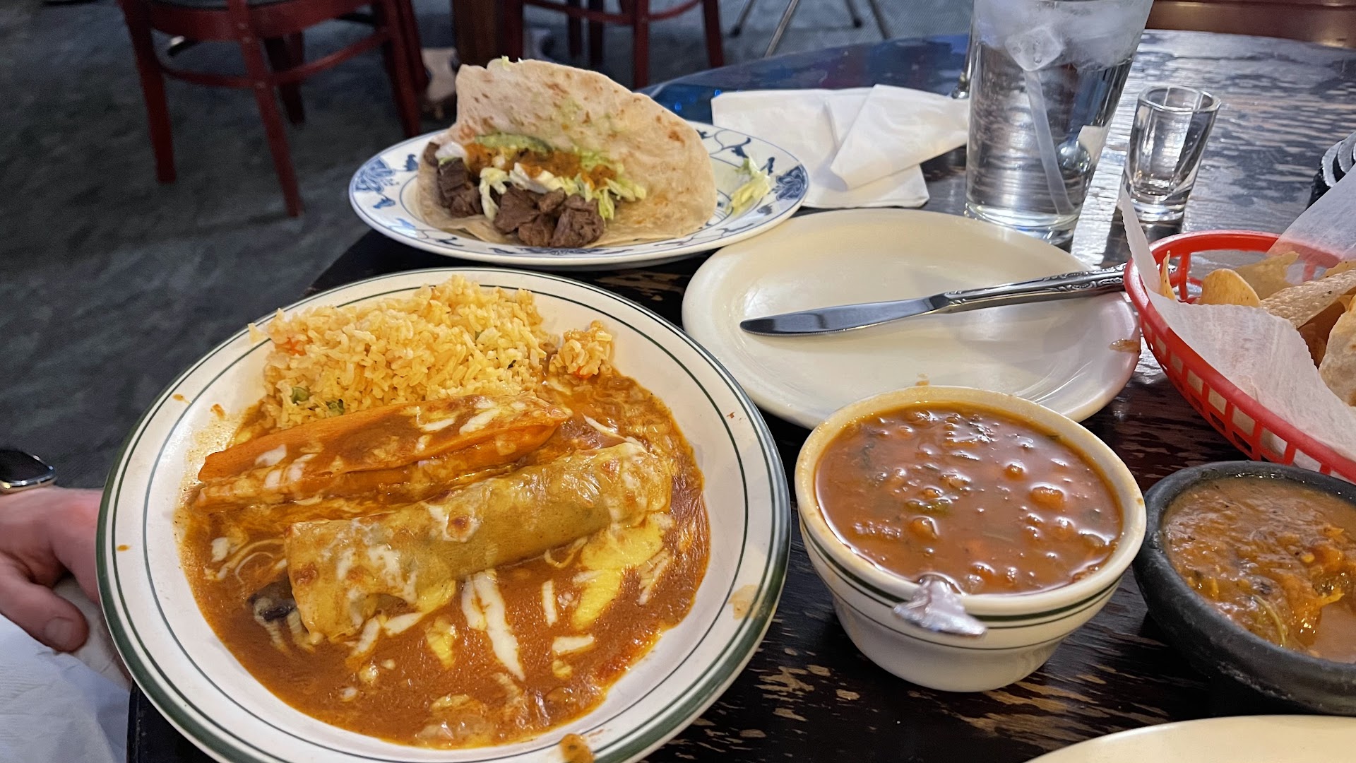 Weâll let me tell you, something is wrong with everybodyâs taste because food at this place has no flavor! Not at all! We got beef and chicken enchiladas. Neither beef nor chicken was seasoned, rice is mushy and has carrots and peas in it, out of three enchiladas only one and a half was covered in sauce and barely any cheese. I guess refied beans were just as any refried beans - nothing to brag about, but nothing to complain. I also hated the free salsa - again, barely any flavor, very watery.