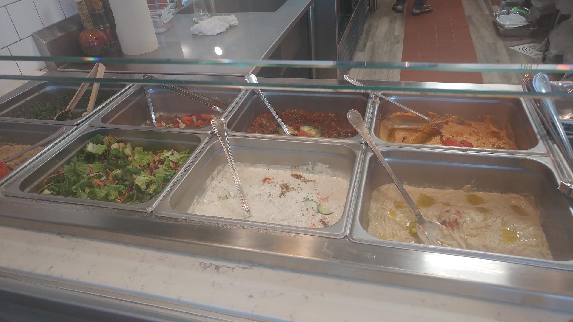When I went there they have salad bar, which have, tabooli, hummus, baba ganoosh, garlic paste, etc etc and all the goodies. They have a buffet menu which is like three or four dishes for the day. I am guessing those dishes are always varies. That day they had rice, falafel, grilled chicken with tomato, potatoes and chick pea gravy. I don't know what it called but man it was fresh and delicious. I loved it. I also ordered one beef shawarma, chicken shawarma, chicken shsih tawook and areesh( beef kabab in a pita bread) and sampler salad( hummus, falafel, kibbeh tabooli) Also I was given rice pudding and other items on the house which was very nice of them.