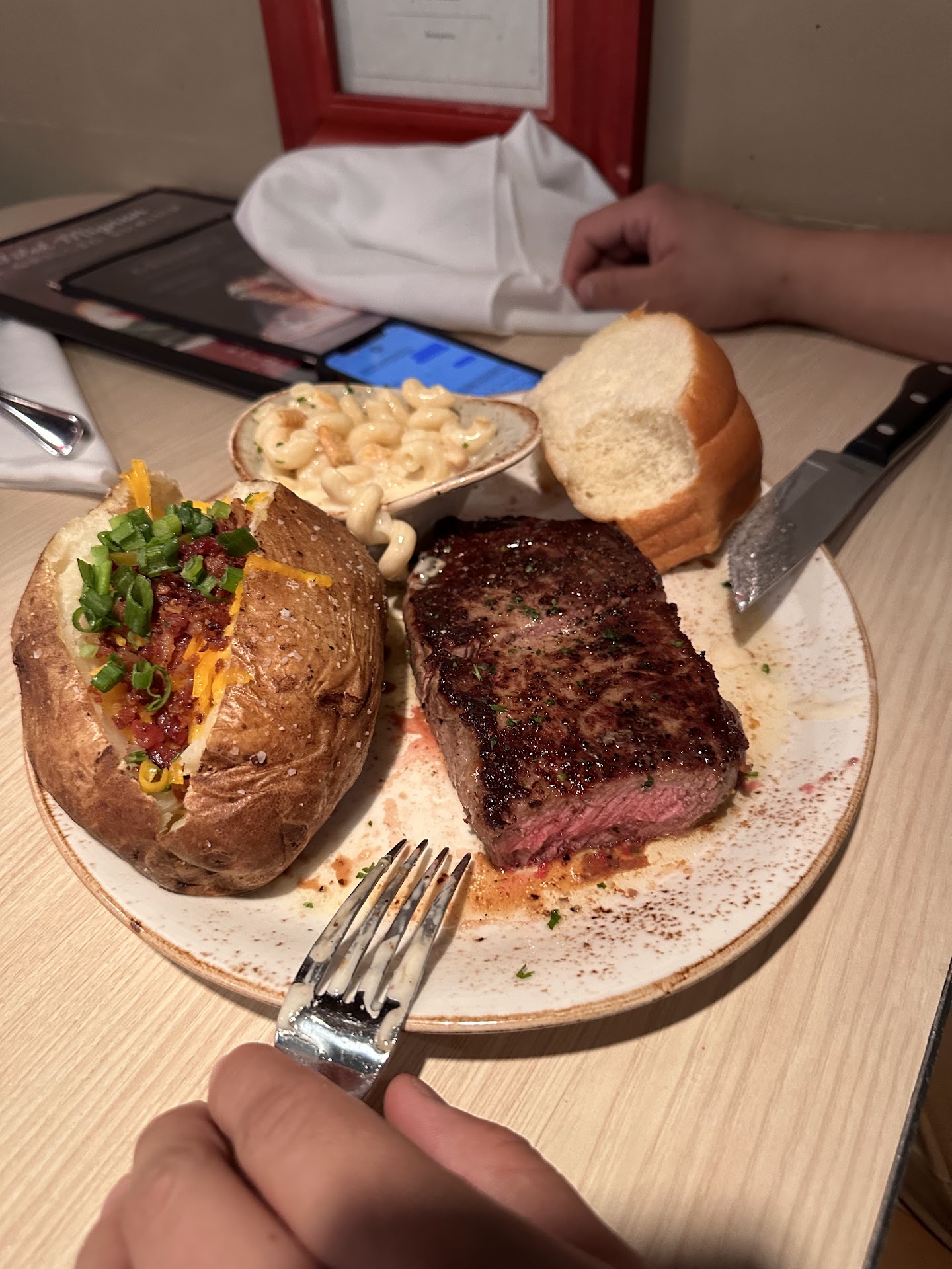 From the moment we sat down, it took an agonizing 70 minutes for our food to arrive. When it finally did, it was barely warm, almost room temperature. I stay with confidence. My food had been sitting out for too long because I ordered a baked potato that arrived without butter, so I simply grabbed some from the table myself. However, the potato wasn't even hot enough to melt the butter, which was at the moment a lil funny tbh but also incredibly frustrating at the same time.